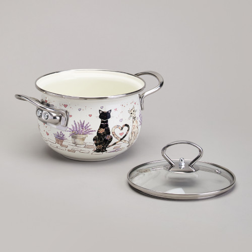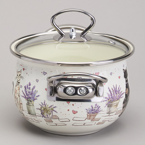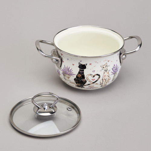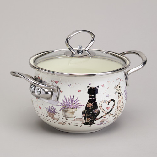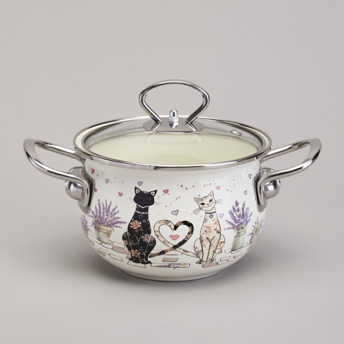 Кастрюля эмалированная со стеклянной крышкой серия "LAVENDER CATS", 1,5 л диа. 16см AGNESS 943-075