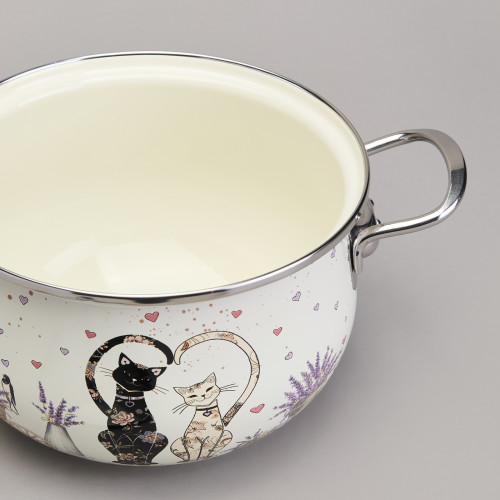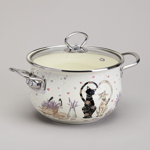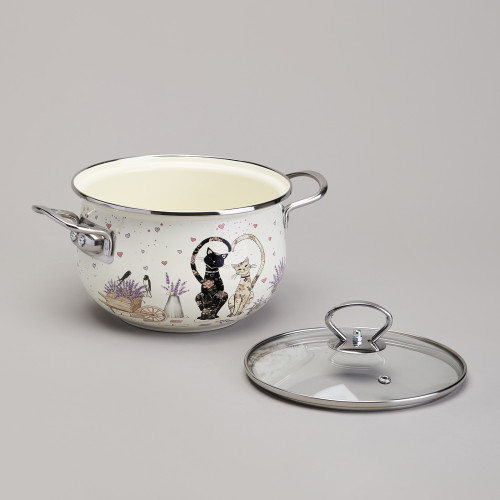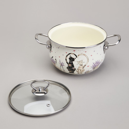 Кастрюля эмалированная со стеклянной крышкой серия "LAVENDER CATS", 2,8 л диа. 20см AGNESS 943-077