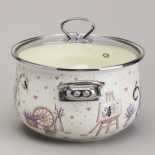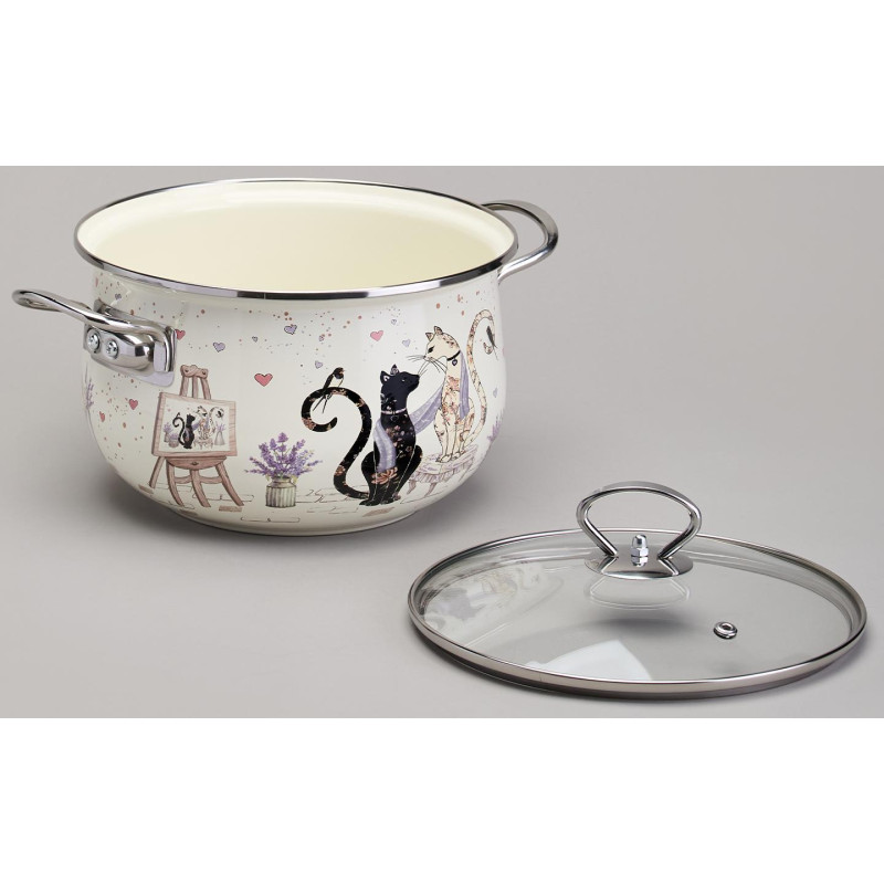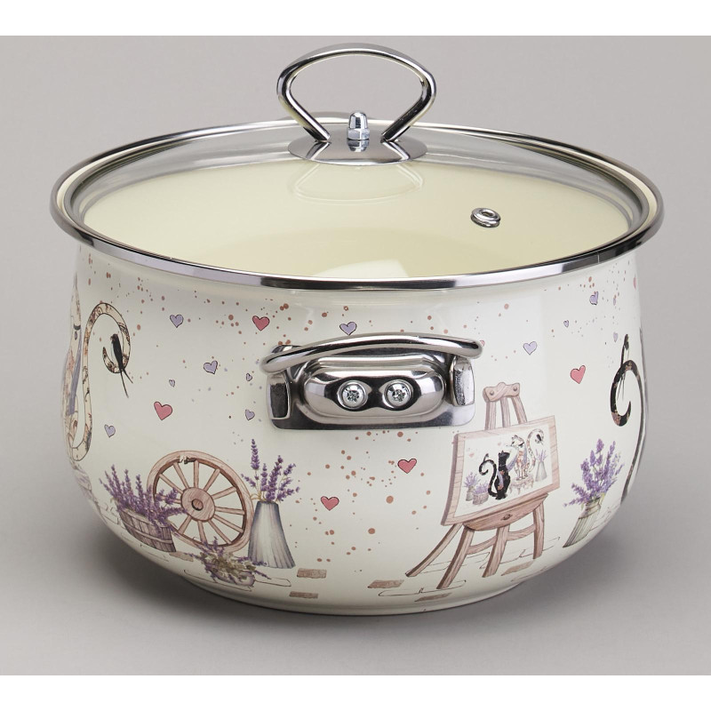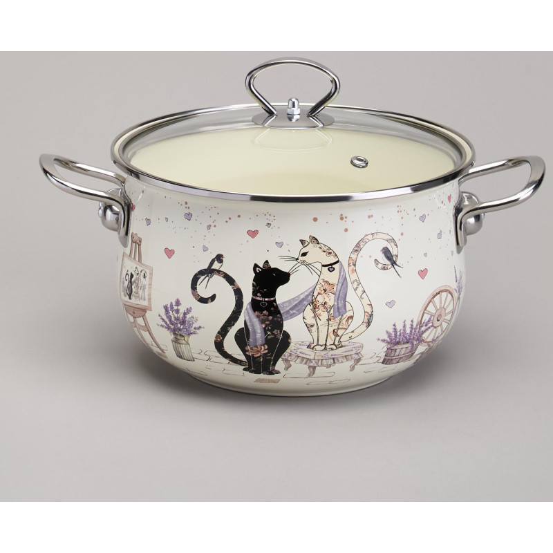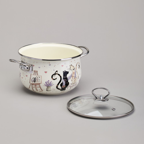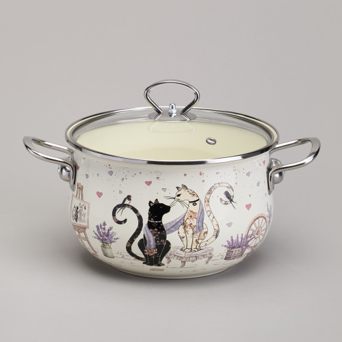 Кастрюля эмалированная со стеклянной крышкой серия "LAVENDER CATS", 3,8 л диа. 22см AGNESS 943-078