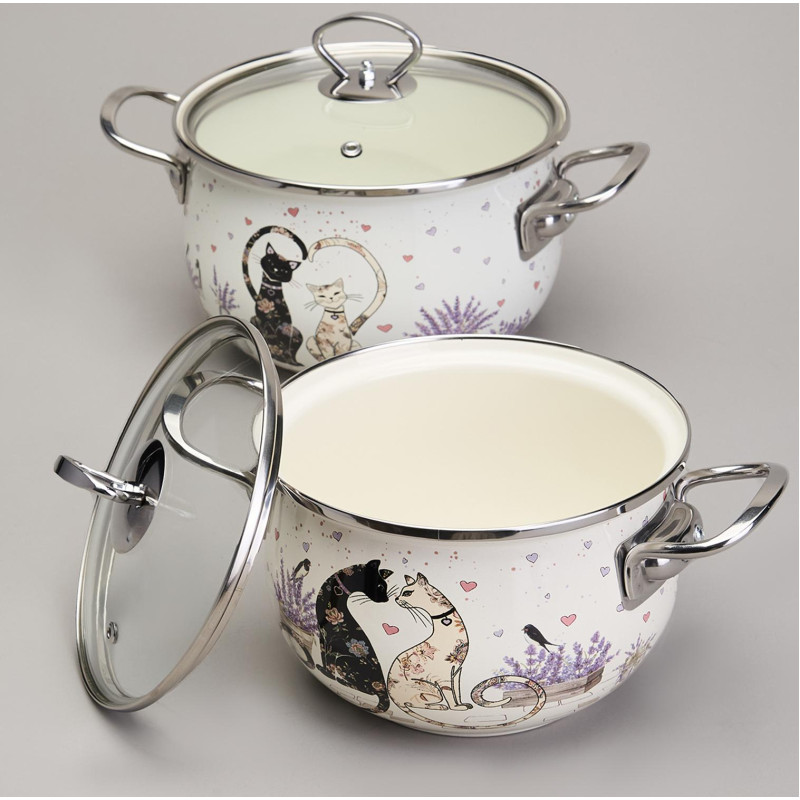 Набор кастрюль эмалированный, серия "LAVENDER CATS" 4пр. 2,0/2,8л диа.18/20см AGNESS 943-102