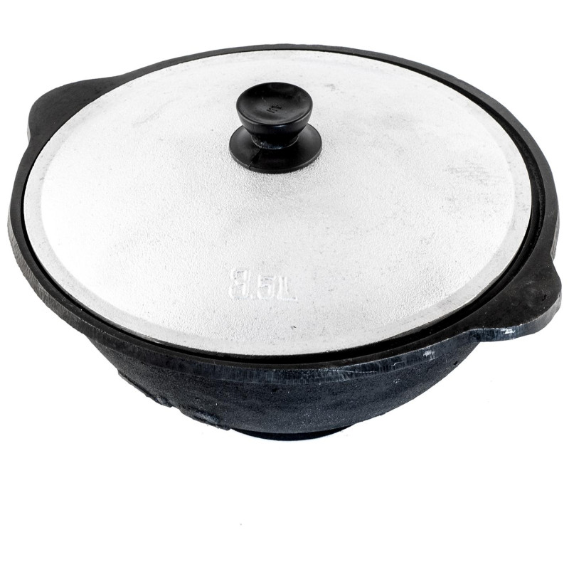 3.5л, внутр. d 27см, h 12см, плоское дно снаружи, внутри круглое дно, чугун, крышка алюминий, литые ручки