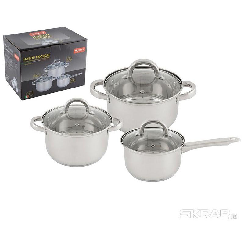 6 предметов: кастрюли 2.6л(18см), 3.6л(20см), ковш 1.9л(16см), сталь, крышки стекло, ручки сталь