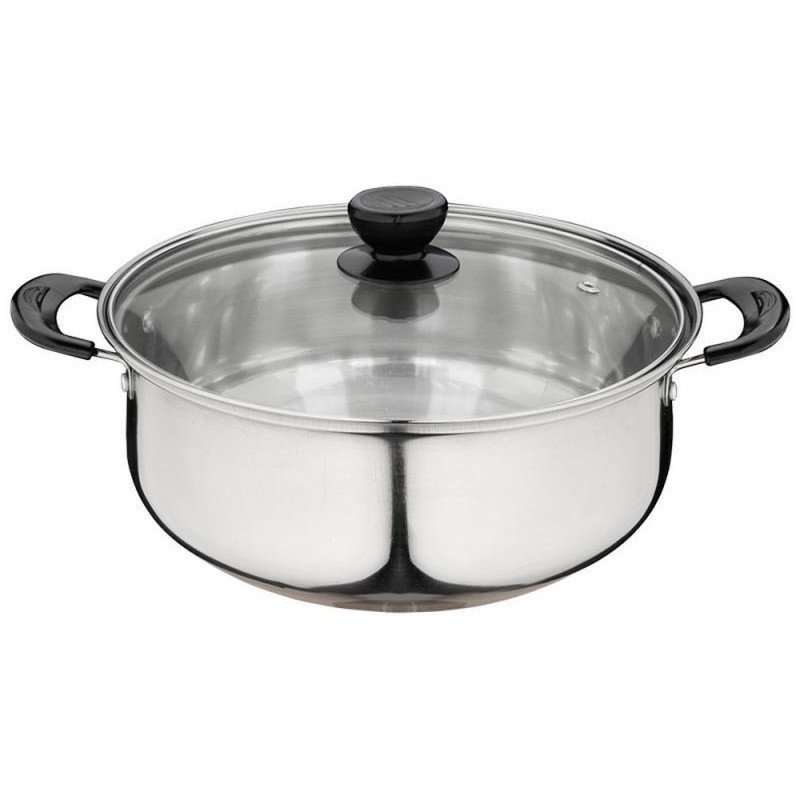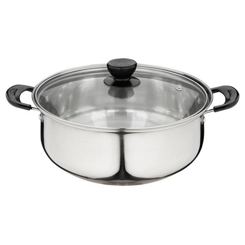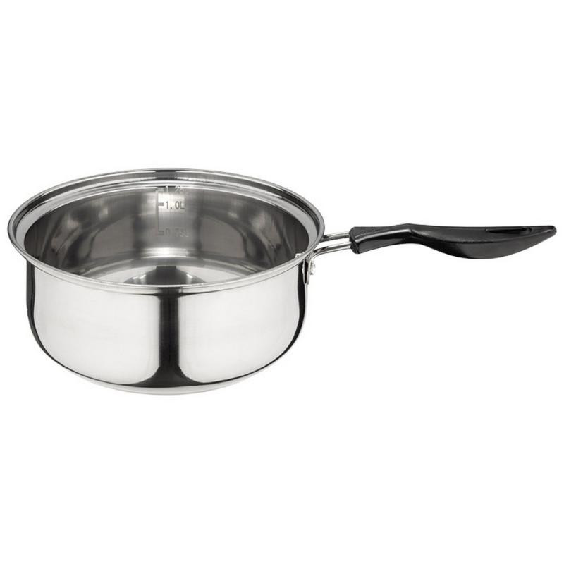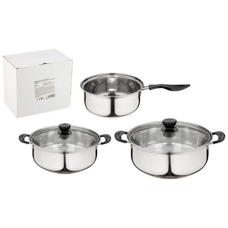 5 предметов, 2 кастрюли 1.25/2.2л, ковш б/крышки 1.25л, нерж.сталь, дно однослойное, зеркальная полировка внутри и снаружи корпуса, отметка литража, крышка стекло, ручка нерж.сталь/нейлон