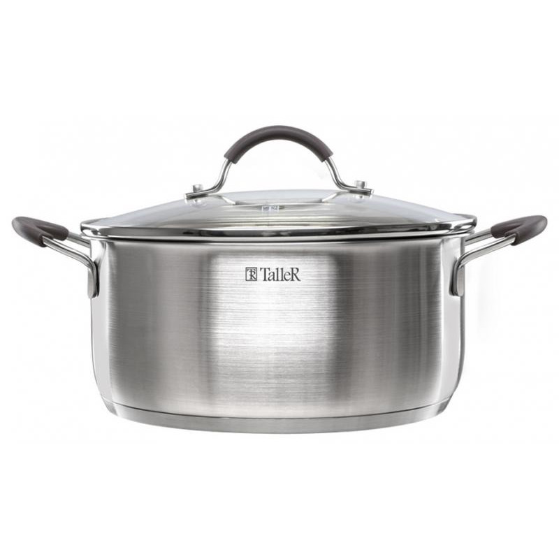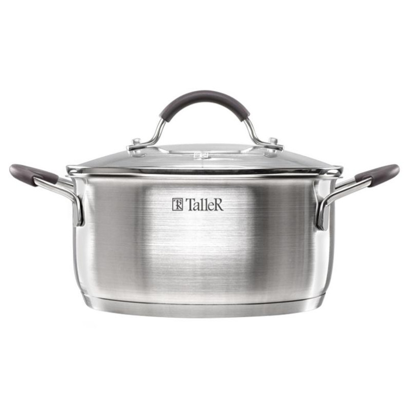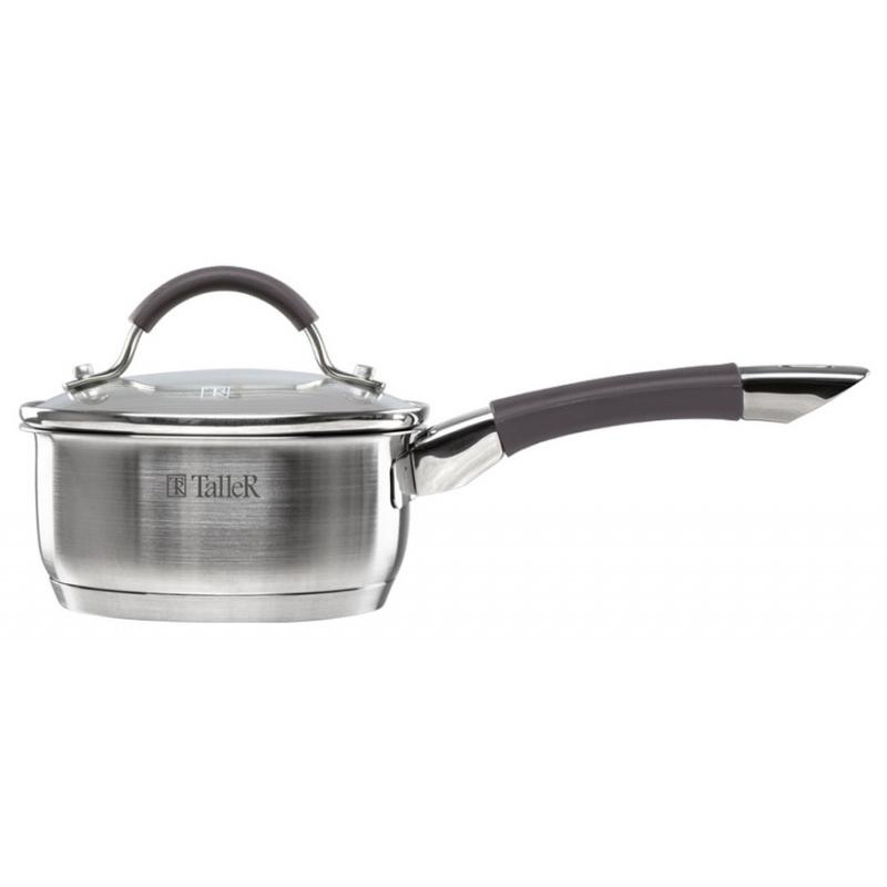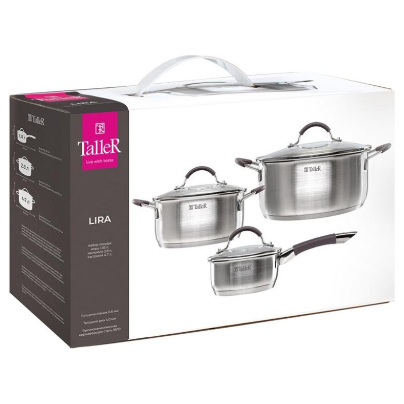 6 предметов: кастрюли сталь 2.8л(20см), 4.7л(24см), ковш сталь 1.35л(16см), крышки стекло/сталь/силикон, ручки сталь, шкала литража, подходит для всех видов плит и для посудомоечной машины