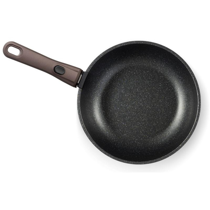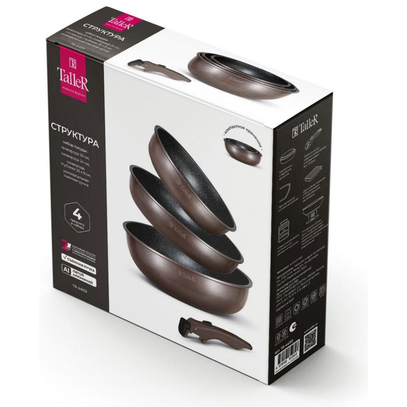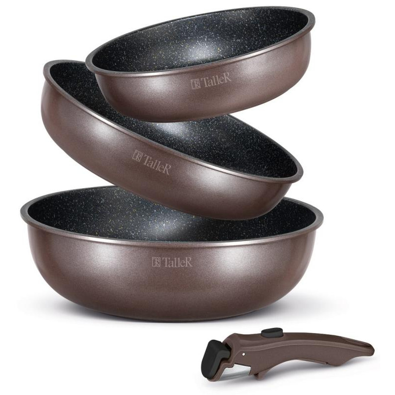 4 предмета, литой алюминий, у внешней поверхности жаропрочное покрытие, сковорода 20х5.5см, сковорода 24х6см, глубокая сковорода 26х8см, универсальная съемная ручка, для всех типов плит, можно использовать в духовом шкафу, рекомендуется ручное мытье