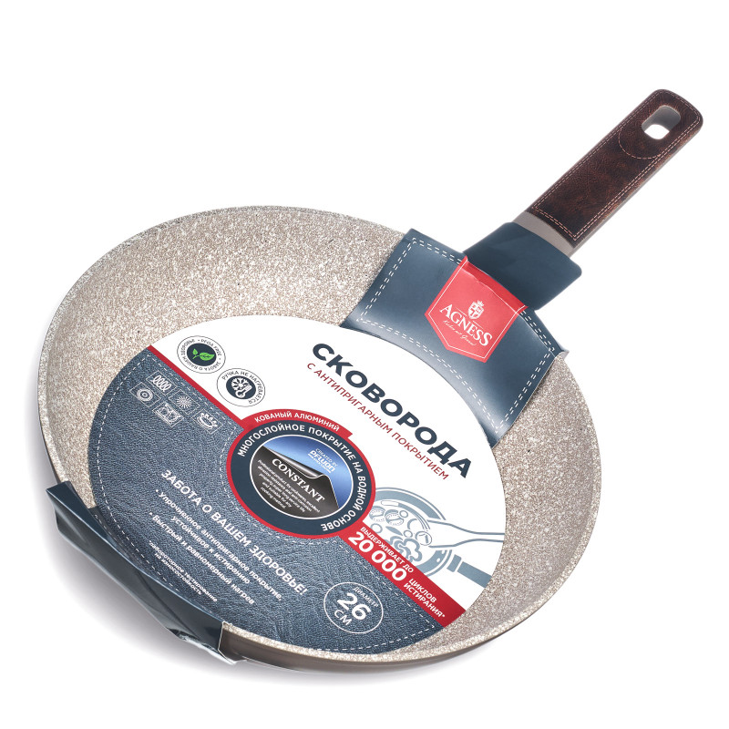 СКОВОРОДА AGNESS С АНТИПРИГАРНЫМ ПОКРЫТИЕМ "CONSTANT" - это идеальный выбор для тех, кто ценит удобство и функциональность в посуде. Одним из главных достоинств этой сковороды является УСИЛЕННОЕ АНТИПРИГАРНОЕ ПОКРЫТИЕ "CONSTANT", которое позволяет готовить без использования большого количества масла и выдерживает до 20 000 циклов истирания. Благодаря этому, продукты готовятся быстрее и сохраняют свои полезные свойства. Равномерное нагревание сокращает время приготовления и сохраняет вкус и аромат продуктов. Многослойная структура покрытия обеспечивает превосходные эксплуатационные качества и увеличивает срок службы, не содержит PFOA. Эргономичная ручка из бакелита со стильными вставками не нагревается и не плавится, обеспечивает безопасное использование сковородки в процессе приготовления пищи. Посуда AGNESS - это современный дизайн и новейшие технологии производства.
