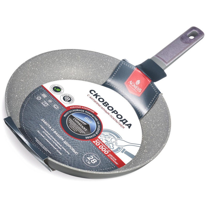 СКОВОРОДА AGNESS С АНТИПРИГАРНЫМ ПОКРЫТИЕМ "CONSTANT" - это идеальный выбор для тех, кто ценит удобство и функциональность в посуде. Одним из главных достоинств этой сковороды является УСИЛЕННОЕ АНТИПРИГАРНОЕ ПОКРЫТИЕ "CONSTANT", которое позволяет готовить без использования большого количества масла и выдерживает до 20 000 циклов истирания. Благодаря этому, продукты готовятся быстрее и сохраняют свои полезные свойства. Равномерное нагревание сокращает время приготовления и сохраняет вкус и аромат продуктов. Многослойная структура покрытия обеспечивает превосходные эксплуатационные качества и увеличивает срок службы, не содержит PFOA. Эргономичная ручка из бакелита со стильными вставками не нагревается и не плавится, обеспечивает безопасное использование сковородки в процессе приготовления пищи. Посуда AGNESS - это современный дизайн и новейшие технологии производства.