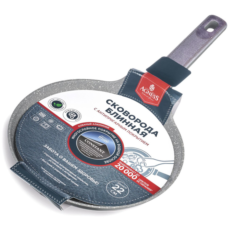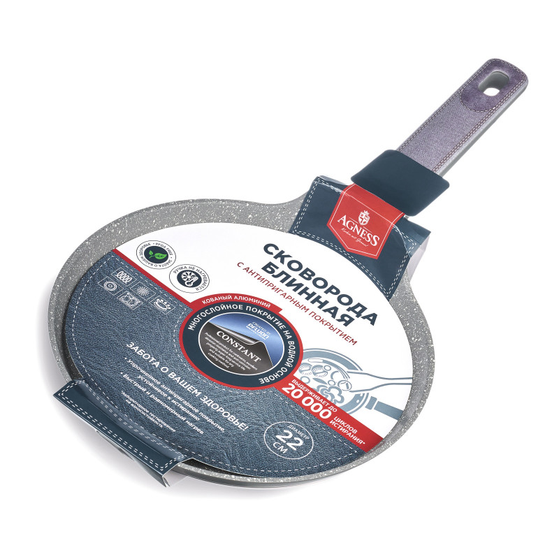 СКОВОРОДА БЛИННАЯ AGNESS С АНТИПРИГАРНЫМ ПОКРЫТИЕМ "CONSTANT" - это идеальный выбор для тех, кто ценит удобство и функциональность в посуде. Одним из главных достоинств этой сковороды является УСИЛЕННОЕ АНТИПРИГАРНОЕ ПОКРЫТИЕ "CONSTANT", которое позволяет готовить без использования большого количества масла и выдерживает до 20 000 циклов истирания. Равномерное нагревание сокращает время приготовления и сохраняет вкус и аромат продуктов. Многослойная структура покрытия обеспечивает превосходные эксплуатационные качества и увеличивает срок службы, не содержит PFOA. Эргономичная ручка из бакелита со стильными вставками не нагревается и не плавится, обеспечивает безопасное использование сковородки в процессе приготовления пищи. Посуда AGNESS - это современный дизайн и новейшие технологии производства.