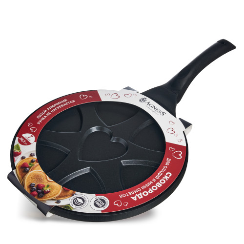 Сковороды AGNESS выполнены из литого алюминия. Такая посуда отличается высокой теплопроводностью и устойчивостью к деформациям. Необычный дизайн сковороды позволит приготовить интересные и веселые оладушки и омлеты.
