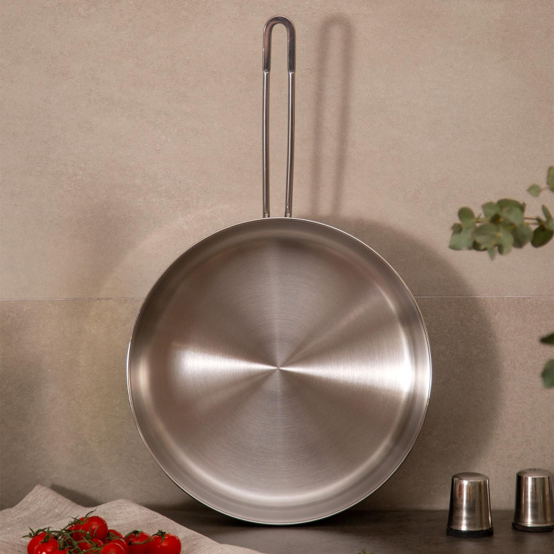 Корпус сковороды выполнен из ВЫСОКОКАЧЕСТВЕННОЙ НЕРЖАВЕЮЩЕЙ ХРОМНИКЕЛЕВОЙ СТАЛИ 18/10.