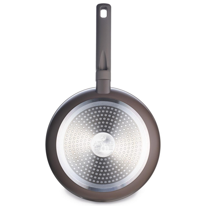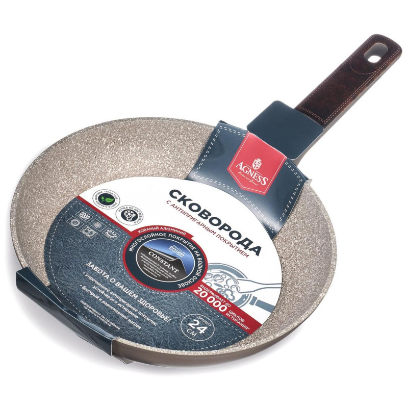 24х4.8см, кованый алюминий, усиленное антипригарное покрытие CONSTANT, ручка из бакелита не нагревается и не плавится, подходит для всех типов плит, включая индукционные, можно мыть в пмм в режиме Eco