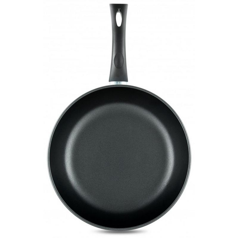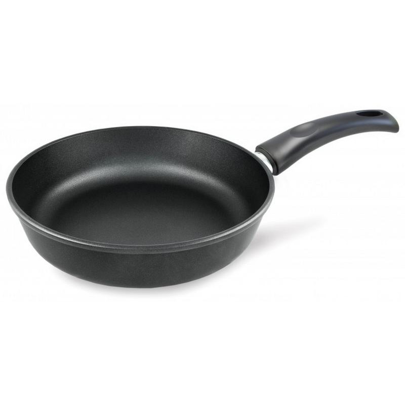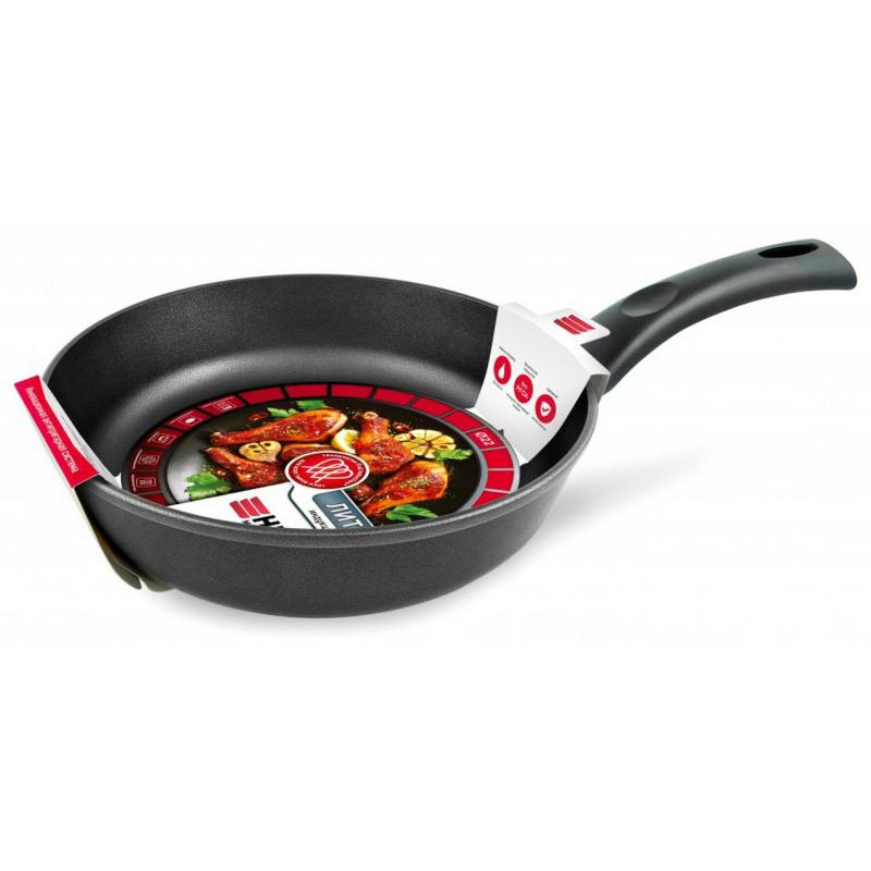 22см, литой алюминий (дно 6.8мм), высота корпуса 56мм, антипригарное покрытие, ручка бакелит, подходит для всех видов плит и д/индукции, подходит для посудомоечной машины