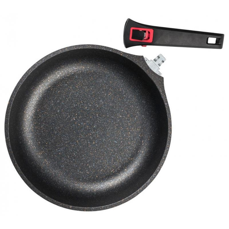 28см, алюминий (дно 4.8мм), внутреннее антипригарное покрытие, ручка бакелит, подходит для всех видов плит, кроме индукции, не подходит для духовки, подходит для посудомоечной машины