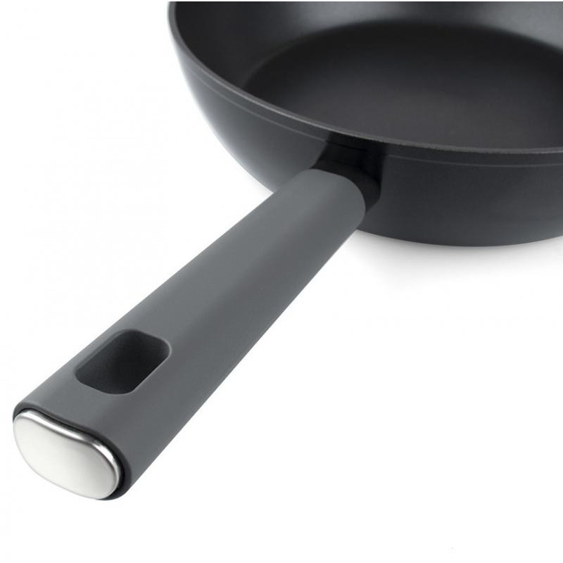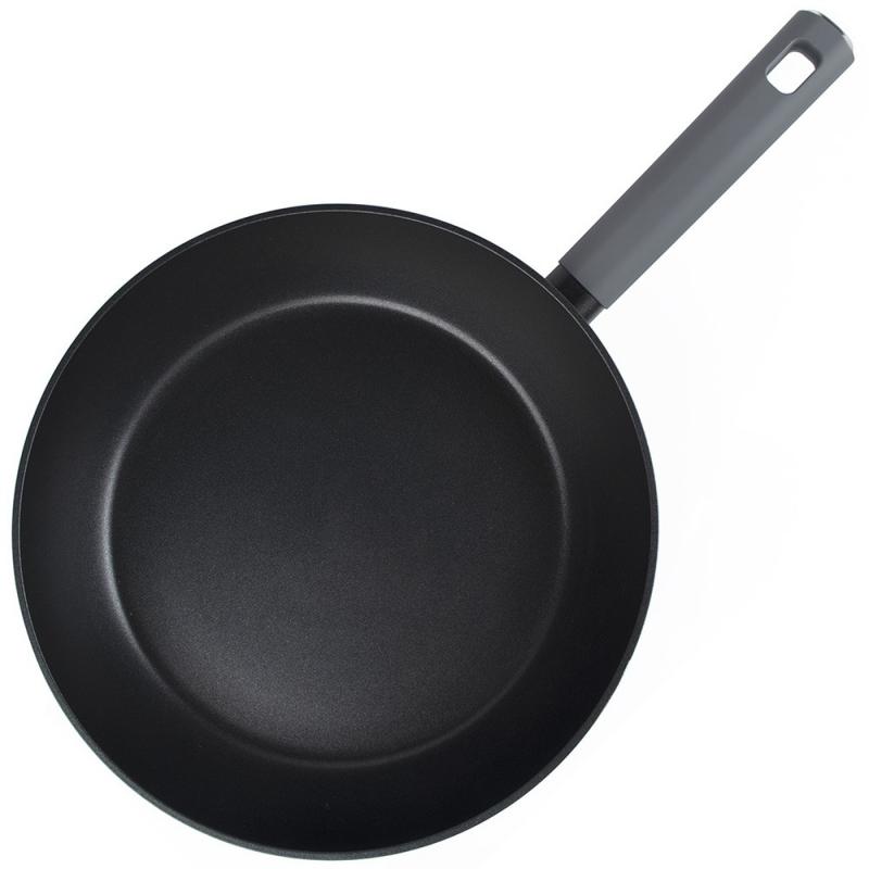 28см, высота 7.5см, алюминий (дно 3.5мм), толщина стенок 2.0мм, ручка бакелит, подходит для всех видов плит, можно мыть в посудомоечной машине без щелочных моющих средств