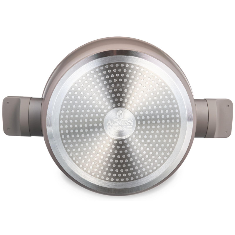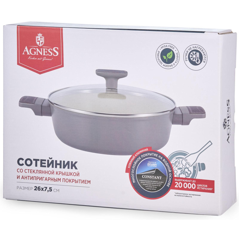 СОТЕЙНИК СО СТЕКЛЯННОЙ КРЫШКОЙ AGNESS С АНТИПРИГАРНЫМ ПОКРЫТИЕМ "CONSTANT" - это идеальный выбор для тех, кто ценит удобство и функциональность в посуде. Одним из главных достоинств этого сотейника является УСИЛЕННОЕ АНТИПРИГАРНОЕ ПОКРЫТИЕ "CONSTANT", которое позволяет готовить без использования большого количества масла и выдерживает до 20 000 циклов истирания. Благодаря этому, продукты готовятся быстрее и сохраняют свои полезные свойства. Равномерное нагревание сокращает время приготовления и сохраняет вкус и аромат продуктов. Многослойная структура покрытия обеспечивает превосходные эксплуатационные качества и увеличивает срок службы, не содержит PFOA. Эргономичные ручки из бакелита со стильными вставками не нагреваются и не плавятся, обеспечивают безопасное использование сотейника в процессе приготовления пищи. Посуда AGNESS - это современный дизайн и новейшие технологии производства.