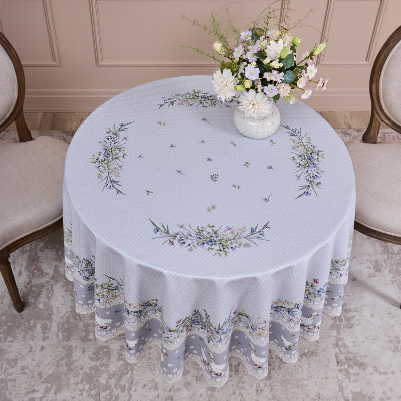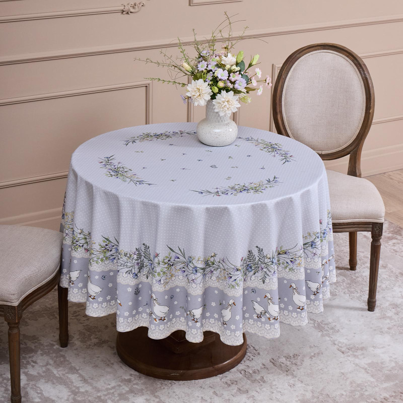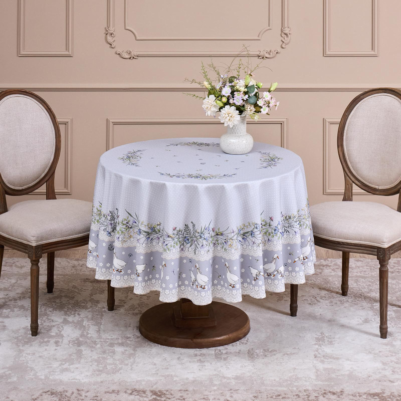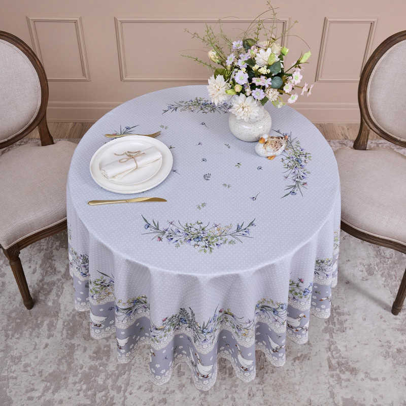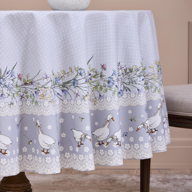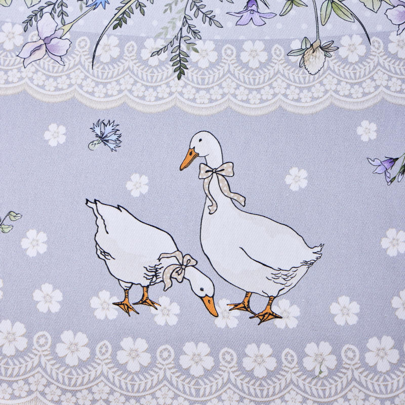 Дизайн выполнен в пастельных тонах: нежно-серый фон в мелкий горох, цветочные мотивы и декоративная кайма с изображениями белых гусей придают скатерти уют и деревенское очарование. Яркий рисунок нанесён методом цифровой печати, что обеспечивает стойкость красок и чёткость деталей.