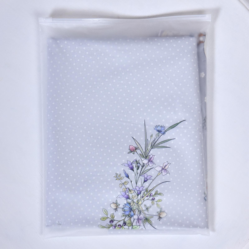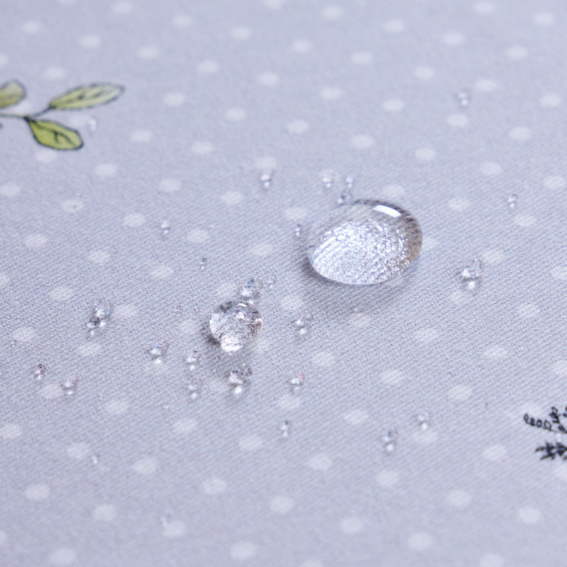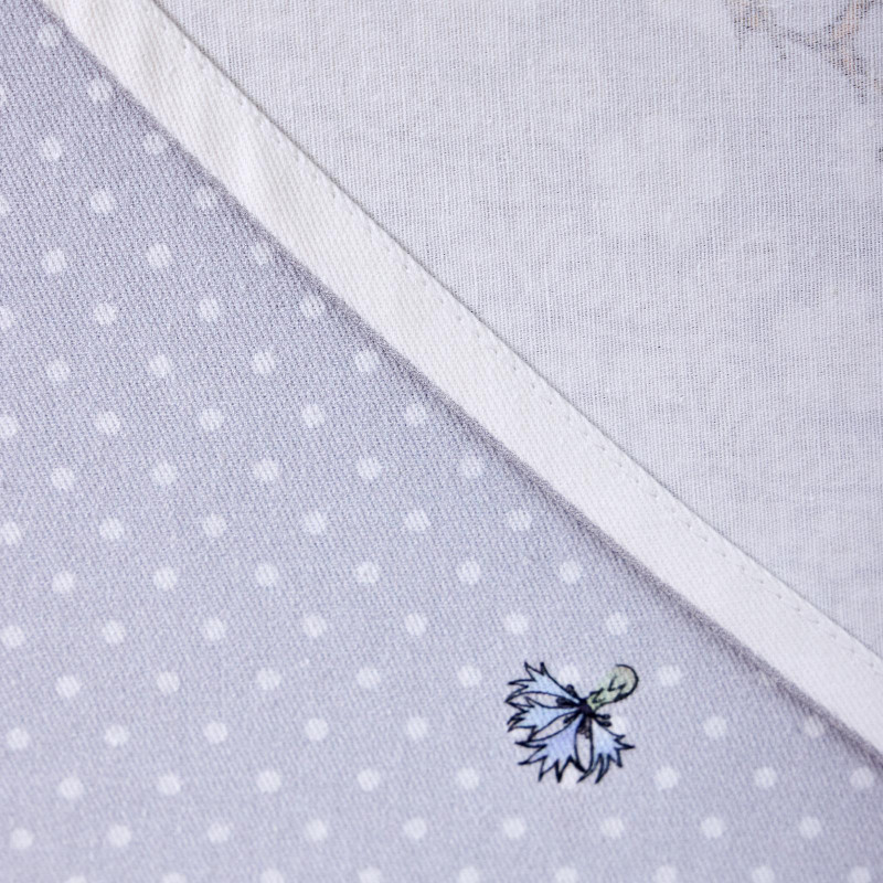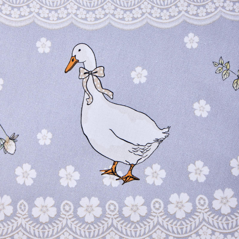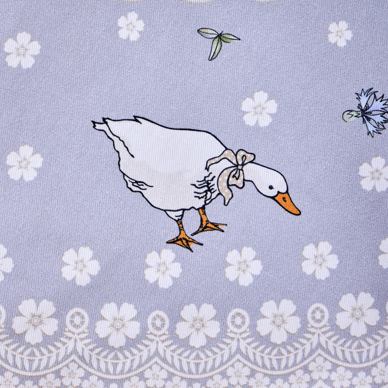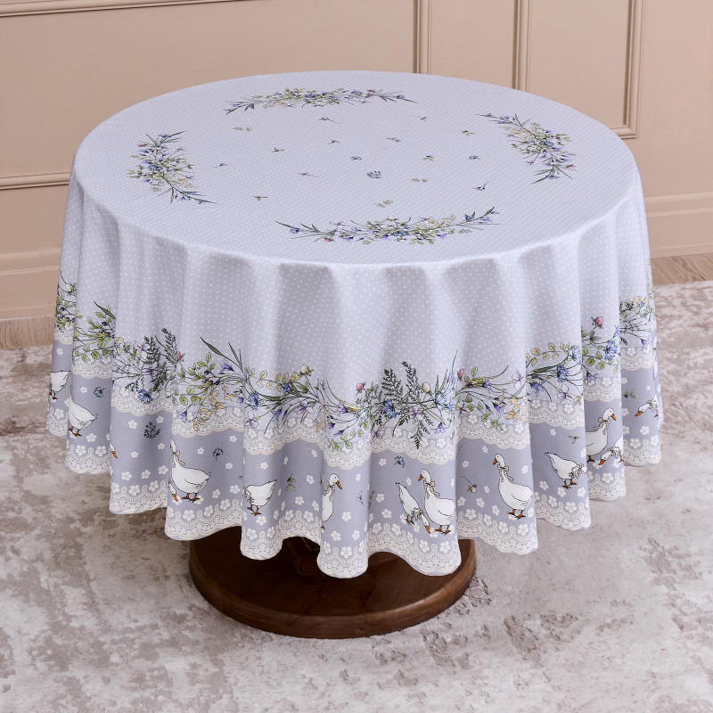 Дизайн выполнен в пастельных тонах: нежно-серый фон в мелкий горох, цветочные мотивы и декоративная кайма с изображениями белых гусей придают скатерти уют и деревенское очарование. Яркий рисунок нанесён методом цифровой печати, что обеспечивает стойкость красок и чёткость деталей.
