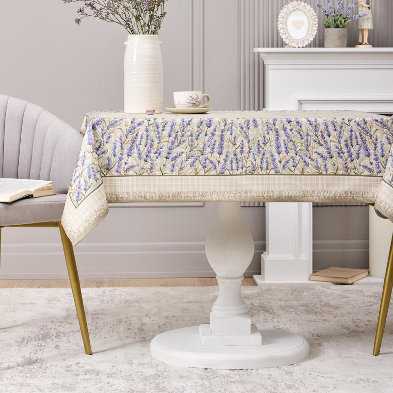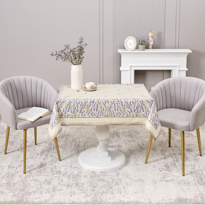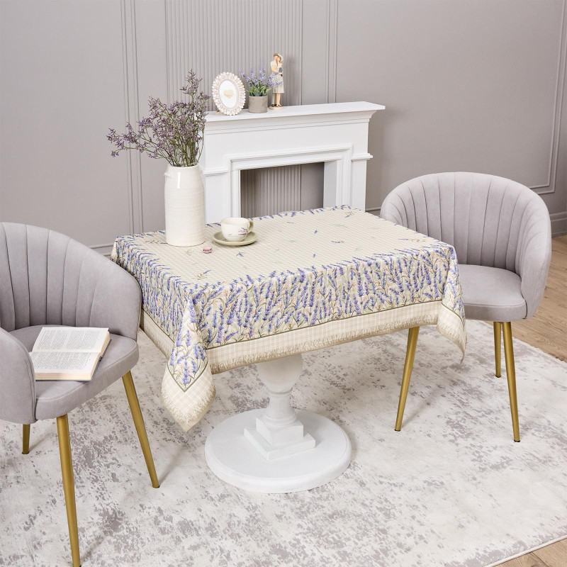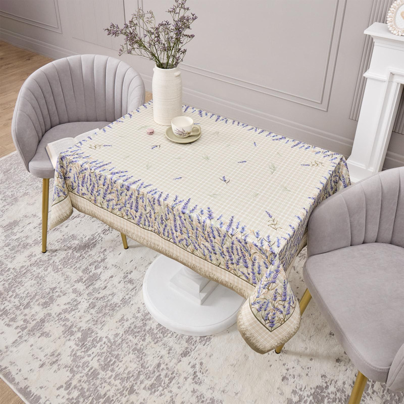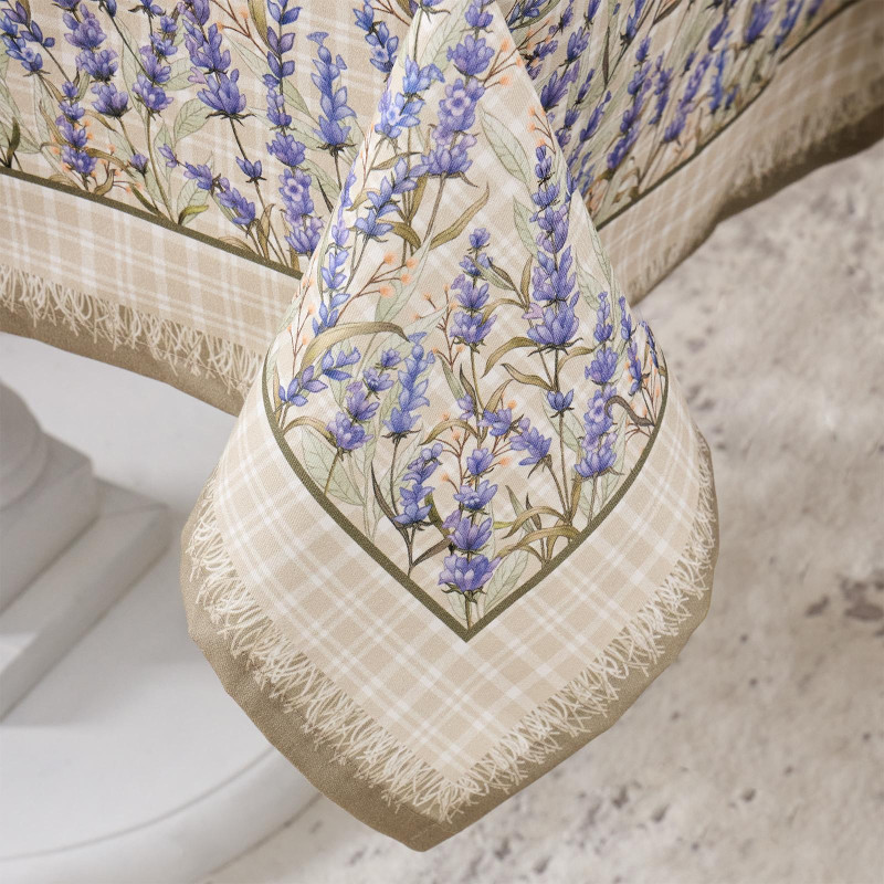 Прямоугольная форма и размер 110×140 см подходят для большинства столов на 2–4 человека. Нежный рисунок с лавандой и клетчатый фон создают уютную атмосферу и гармонично дополняют интерьер в стиле прованс или кантри.