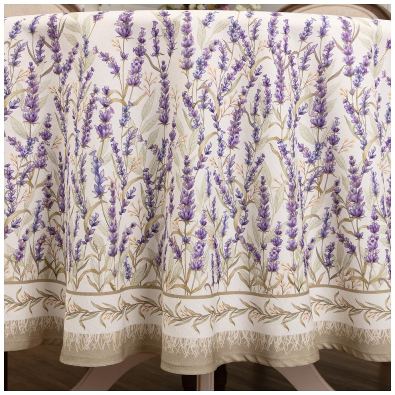 Лавандовый принт с цветочным орнаментом по нижнему краю создаёт атмосферу уюта и лёгкости в духе французского Прованса. Нежные оттенки и натуральная гамма делают скатерть универсальной для любого интерьера — от классического до кантри.