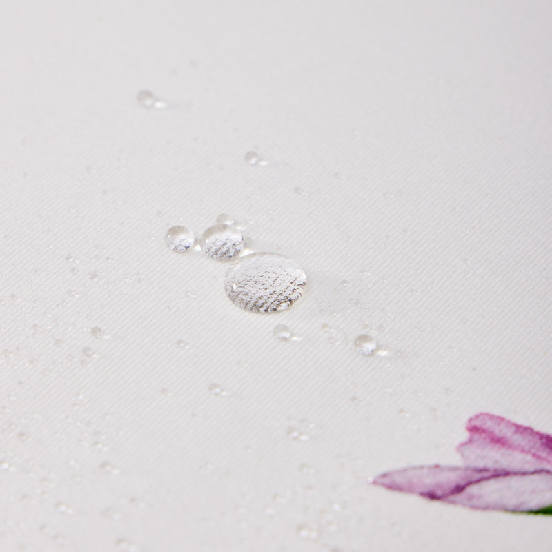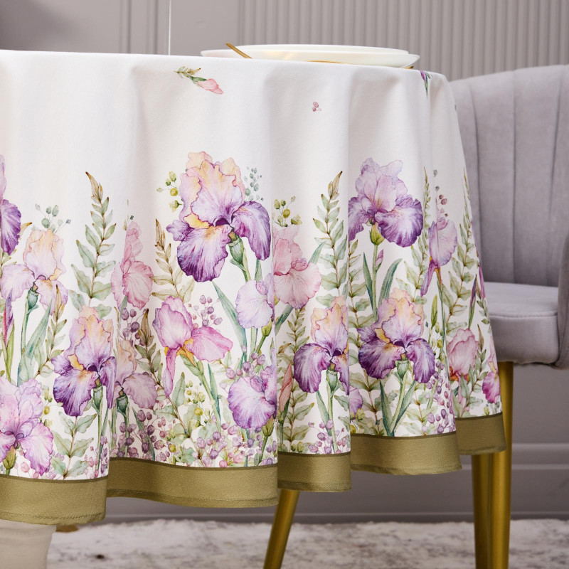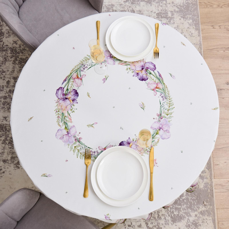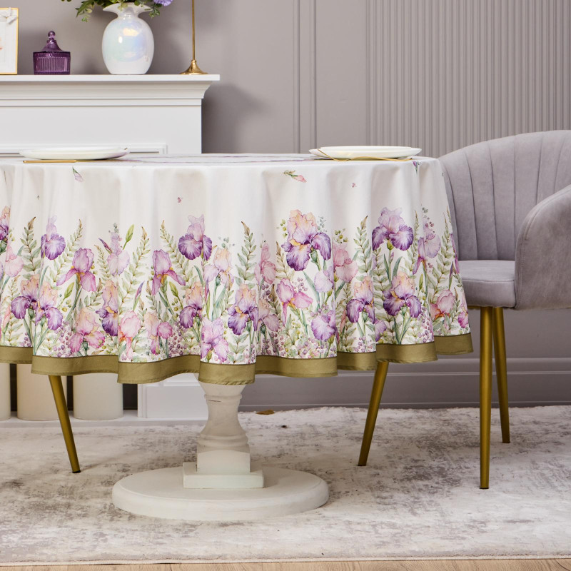 Дизайн украшен цветочным принтом с ирисами и зелёной каймой, выполненный методом цифровой печати — рисунок остаётся ярким и чётким даже после множества стирок. Такая скатерть с принтом создаёт атмосферу уюта, свежести и стиля.