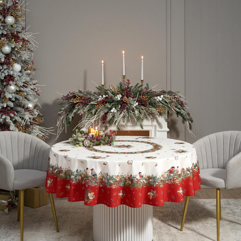 Новогодняя скатерть от Lefard из коллекции Морозко. Снегири— элегантное решение для сервировки праздничного стола. Диаметр 190 см подходит для круглых столов диаметром от 100 до 140 см, создавая равномерный и эстетичный свес.