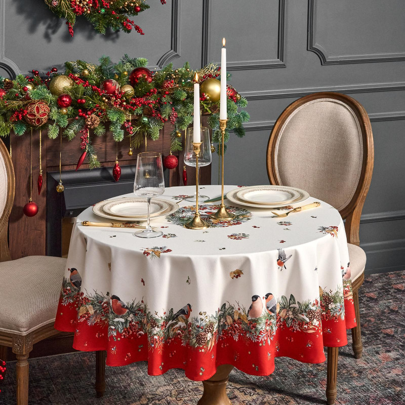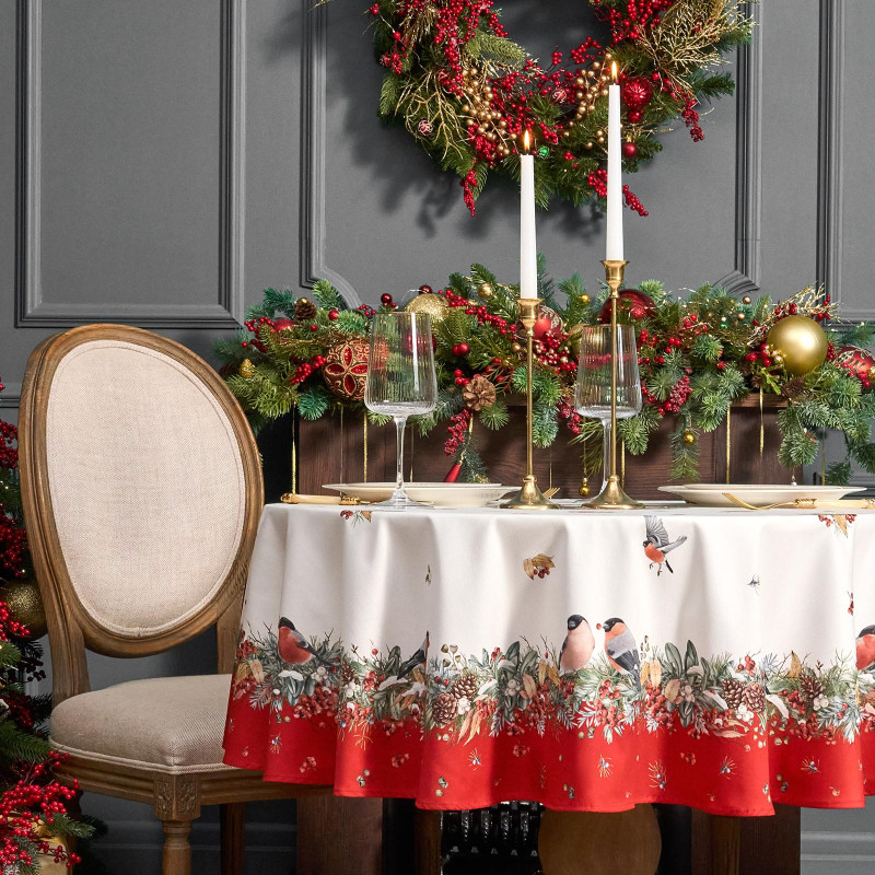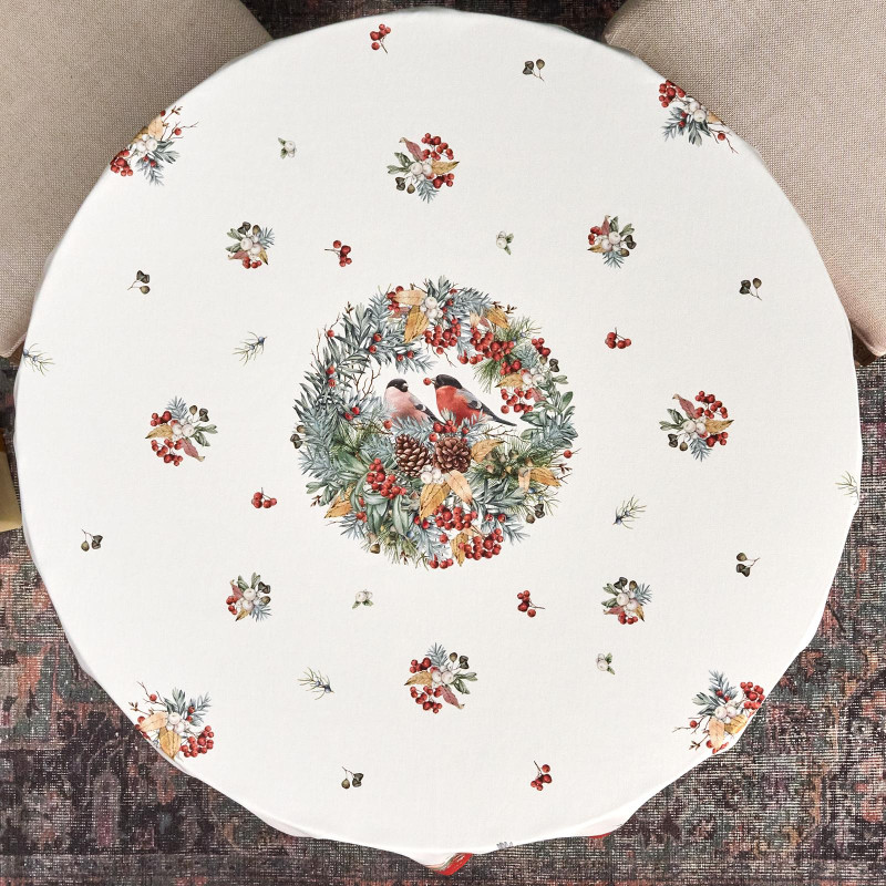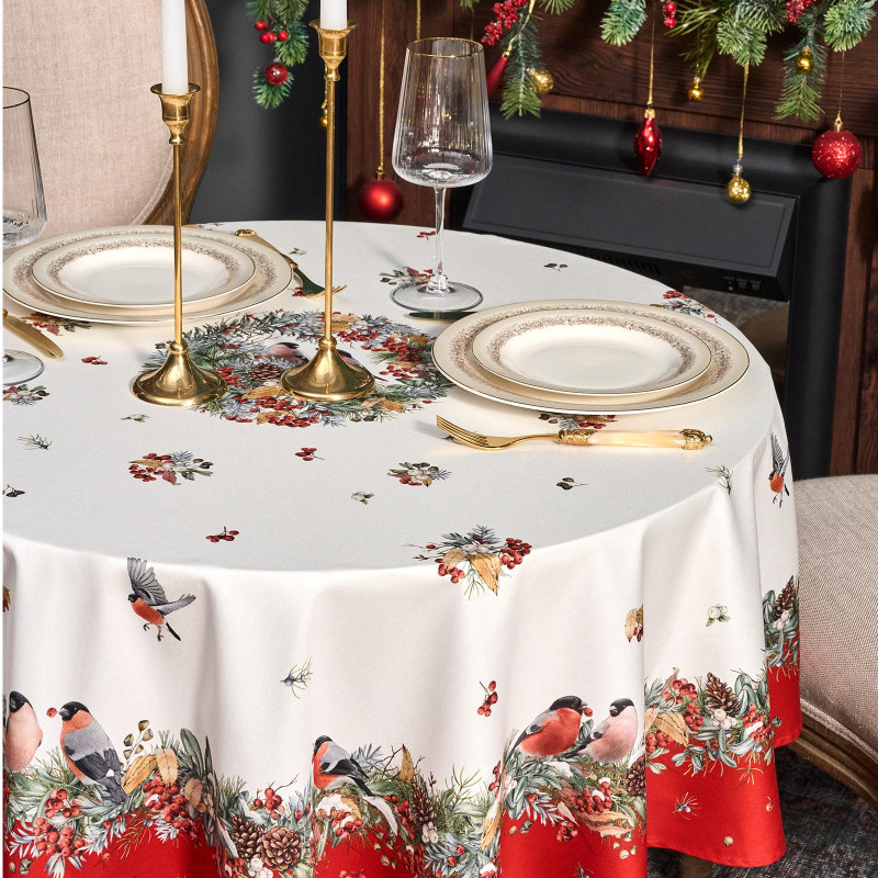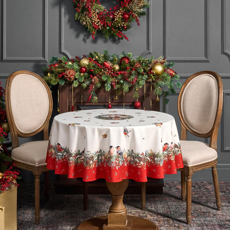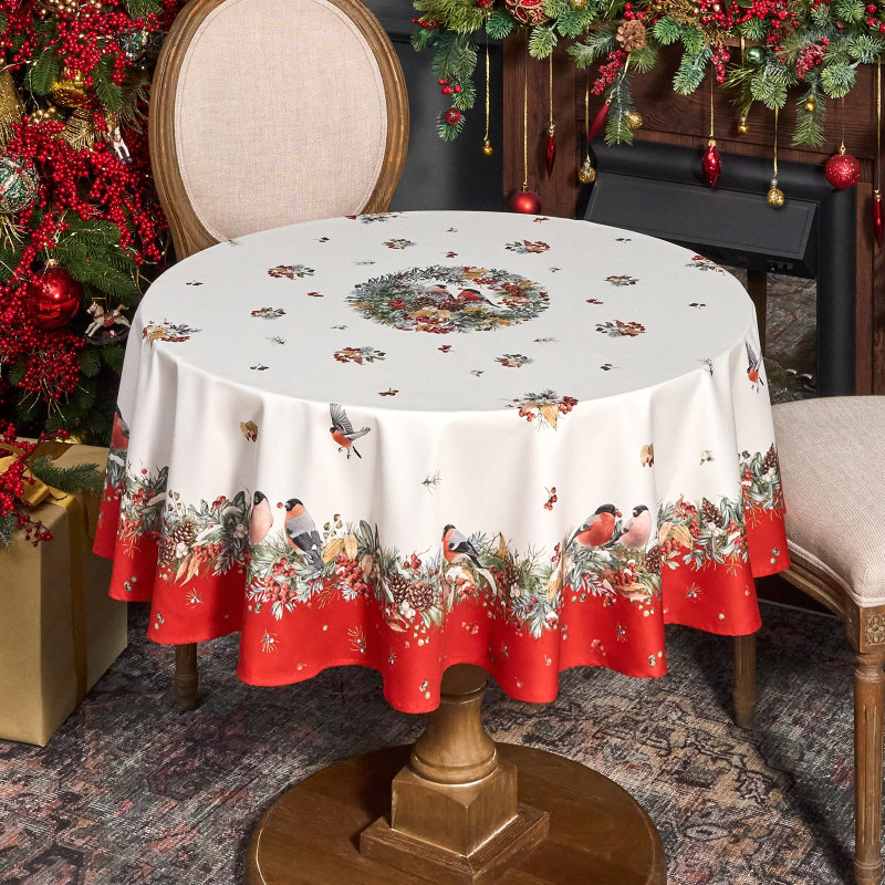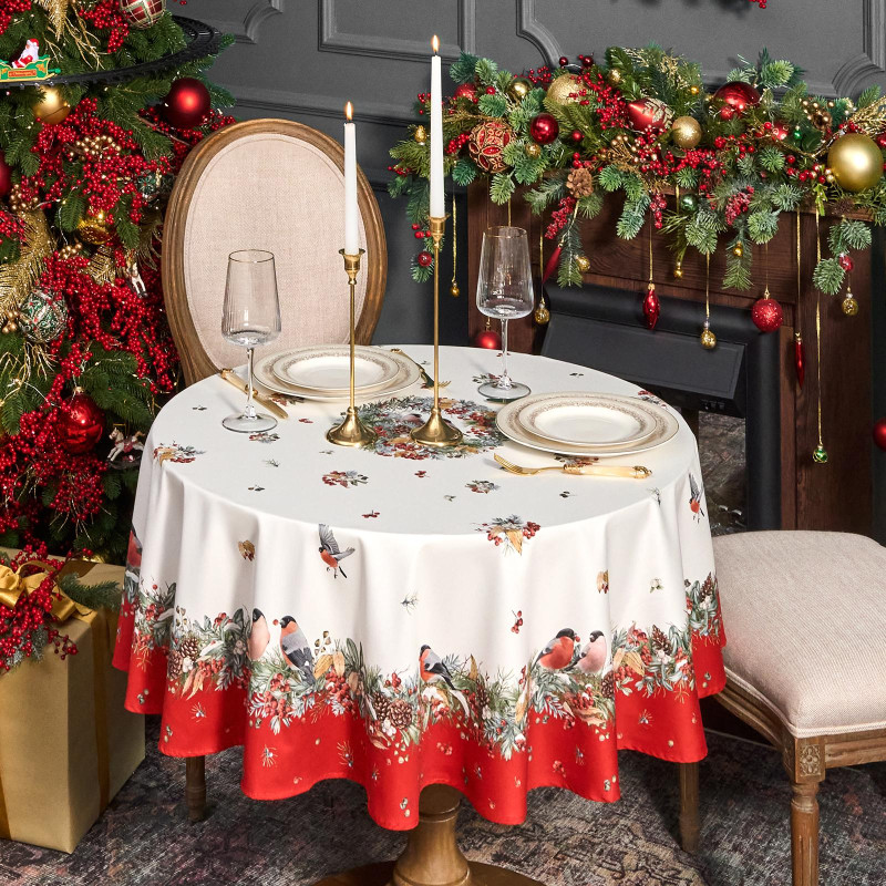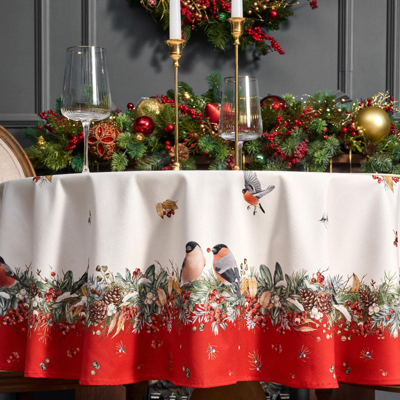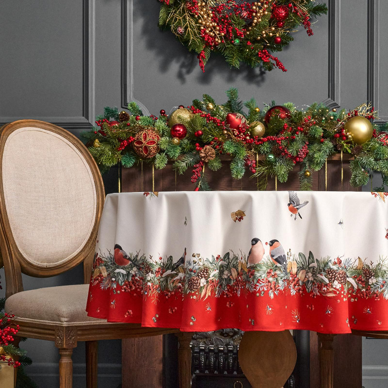 Скатерть круглая "МОРОЗКО . СНЕГИРИ"150см ,красный, 100% хлопок ,твил с пропиткой LEFARD 850-745-23