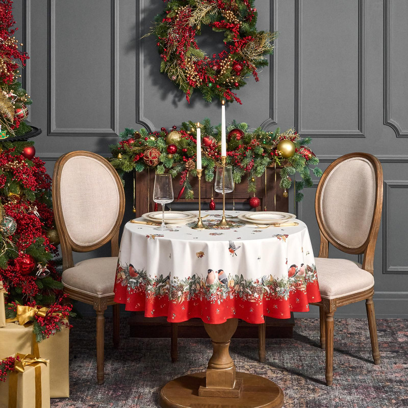 Скатерть от Lefard из коллекции Морозко Снегири — элегантное решение для сервировки праздничного стола. Диаметр 150 см подходит для круглых столов диаметром от 70 до 100 см, создавая равномерный и эстетичный свес.