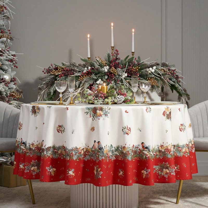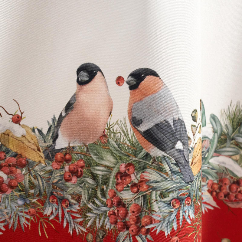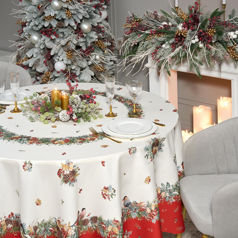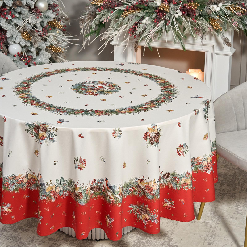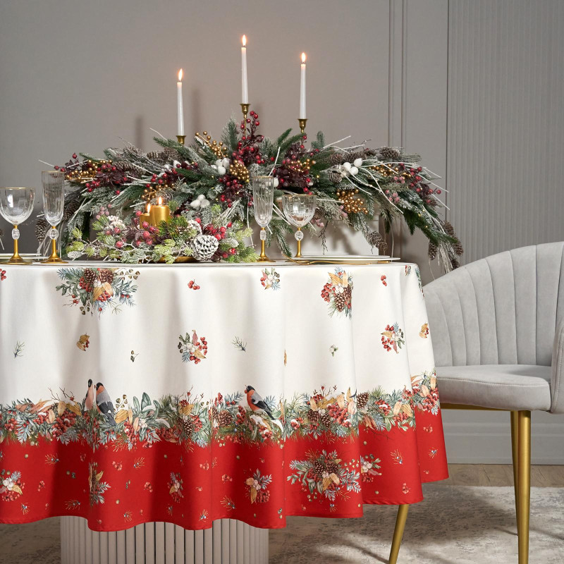 Новогодняя скатерть от Lefard из коллекции Морозко. Снегири— элегантное решение для сервировки праздничного стола. Диаметр 220 см подходит для круглых столов диаметром от 130 до 170 см, создавая равномерный и эстетичный свес.
