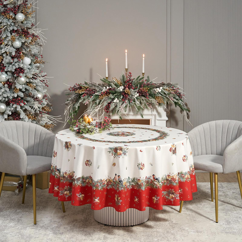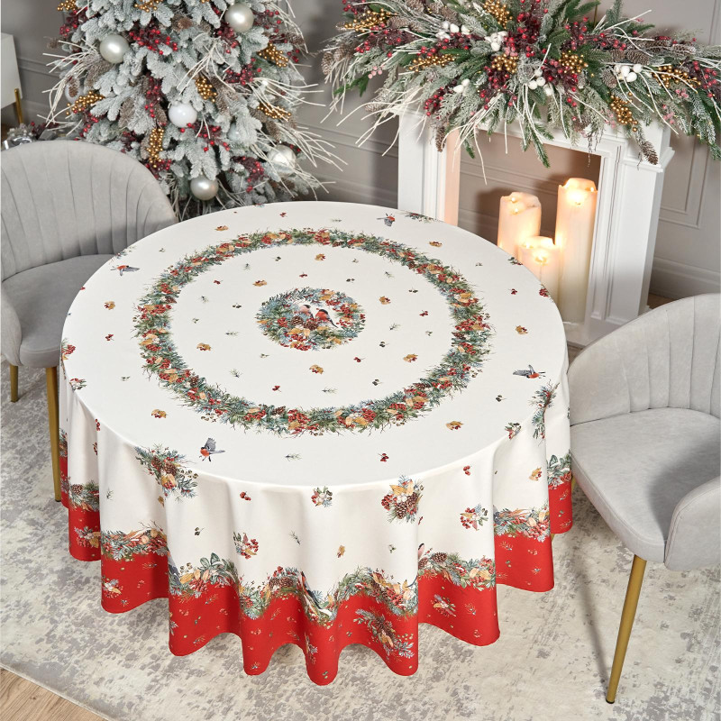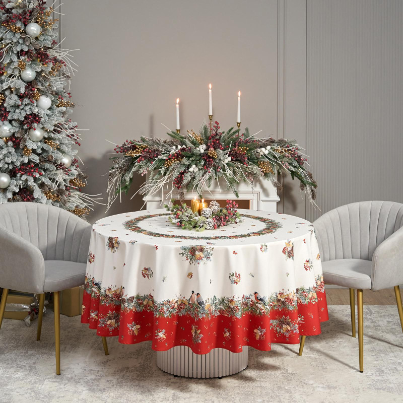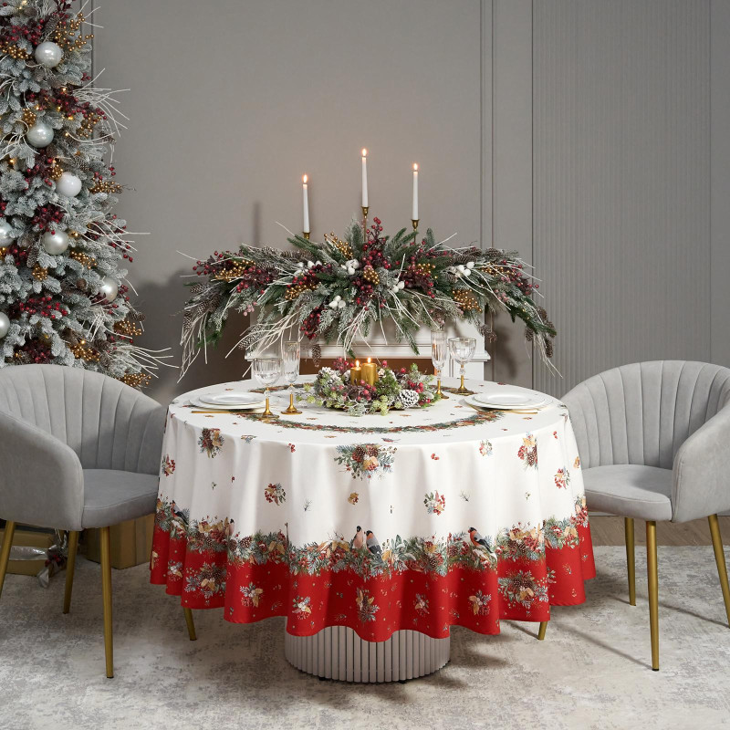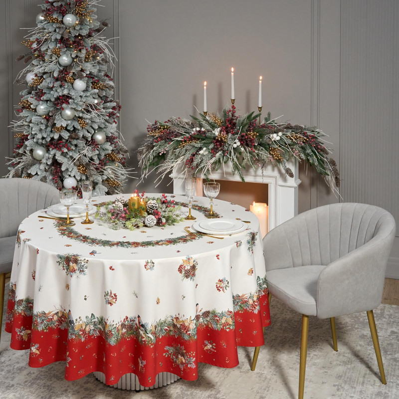 Новогодняя скатерть от Lefard из коллекции Морозко. Снегири— элегантное решение для сервировки праздничного стола. Диаметр 220 см подходит для круглых столов диаметром от 130 до 170 см, создавая равномерный и эстетичный свес.