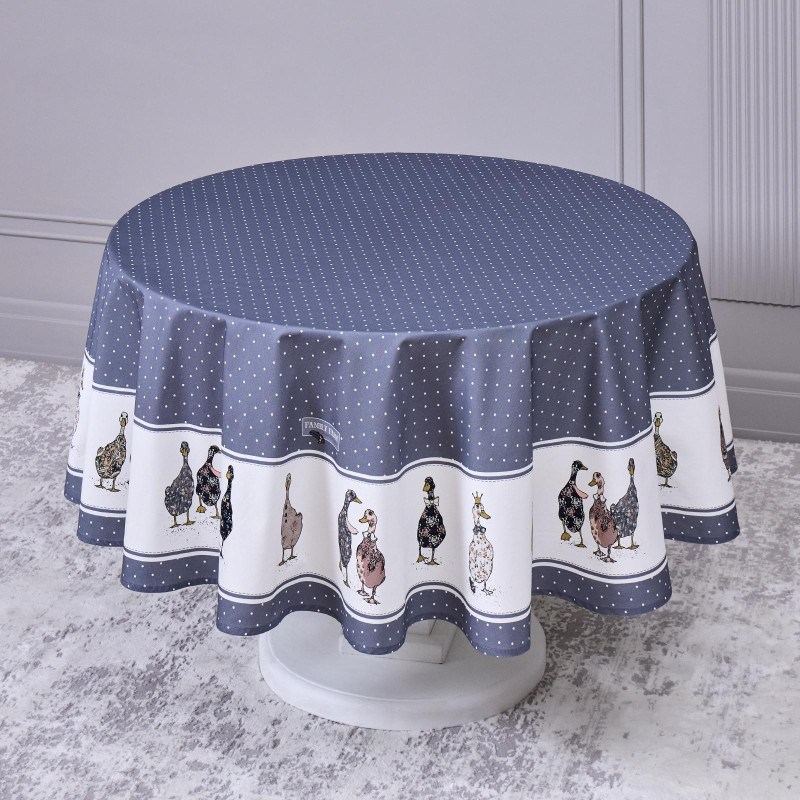 Дизайн в синем цвете с мелким горохом, дополненный декоративной вставкой с изображениями уток и гусей по нижнему краю, придаёт интерьеру оригинальность и уют. Такой принт гармонично впишется как в классическую, так и в современную кухню или столовую.