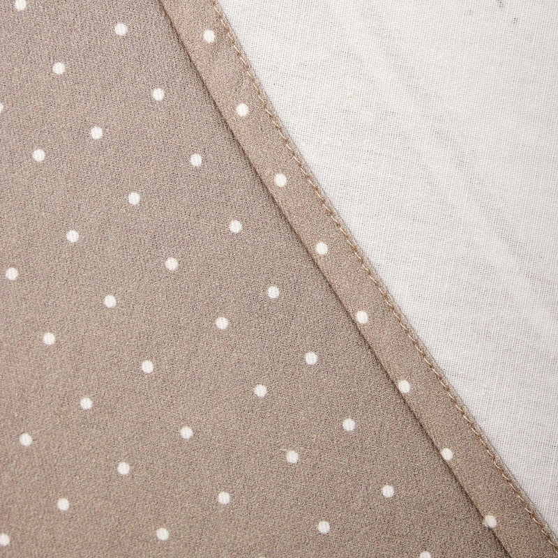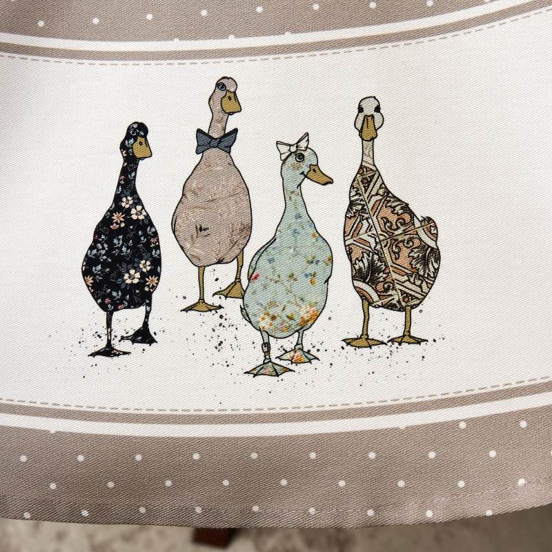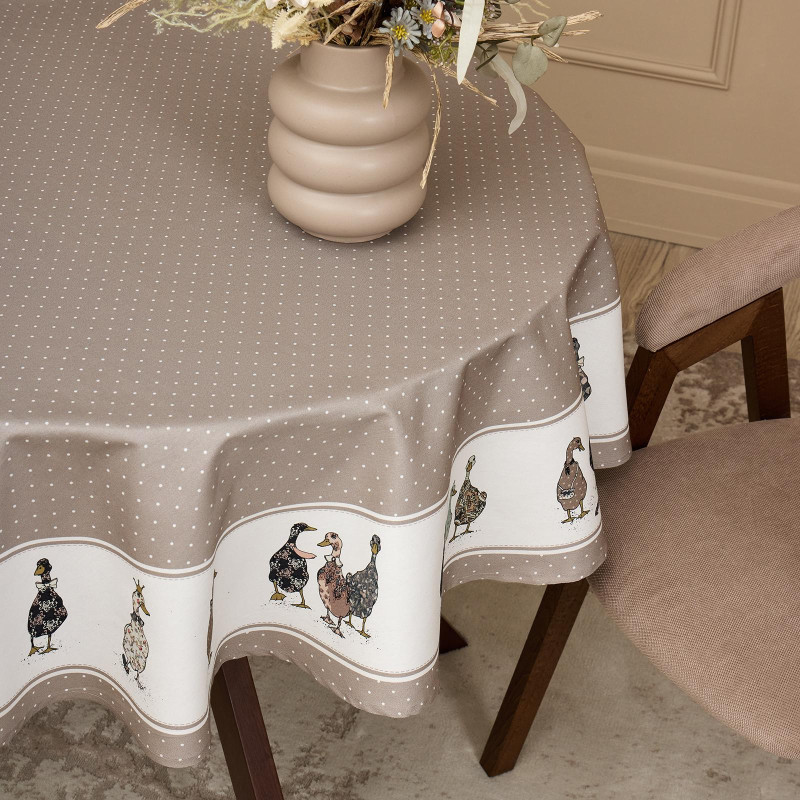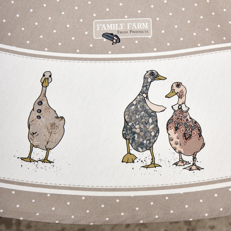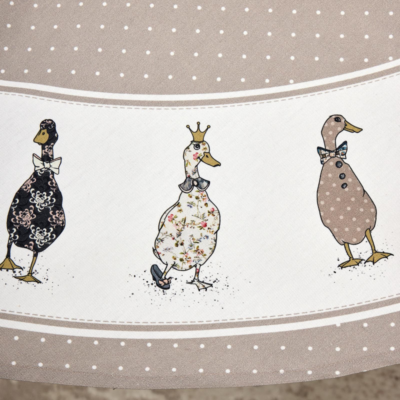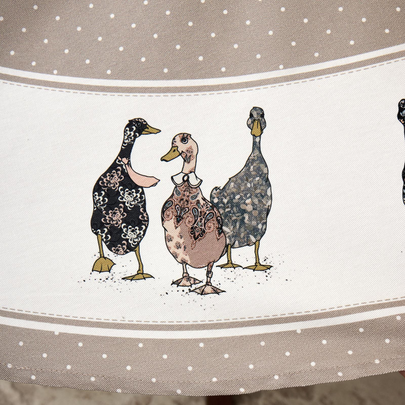 Дизайн в цвете капучино с мелким горохом дополнен декоративной каймой по краю, украшенной изображениями домашних гусей. Принт нанесён методом цифровой печати, что обеспечивает высокую чёткость и стойкость красок даже после многократных стирок.