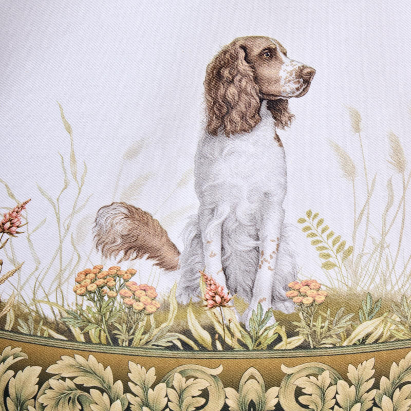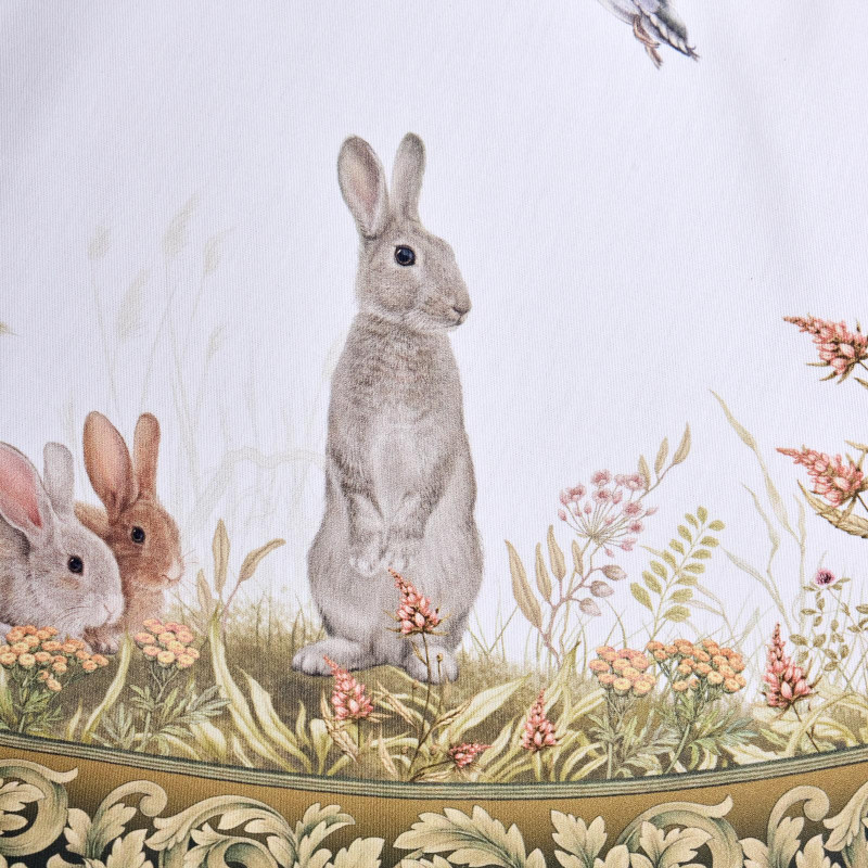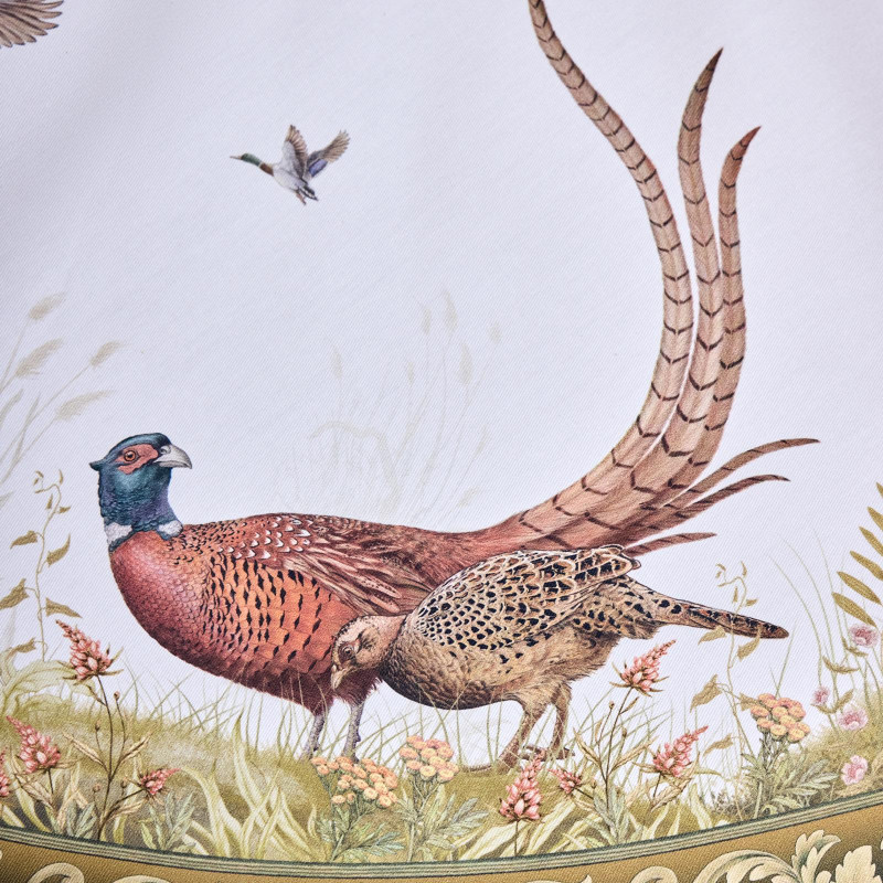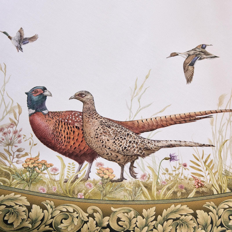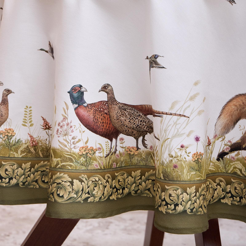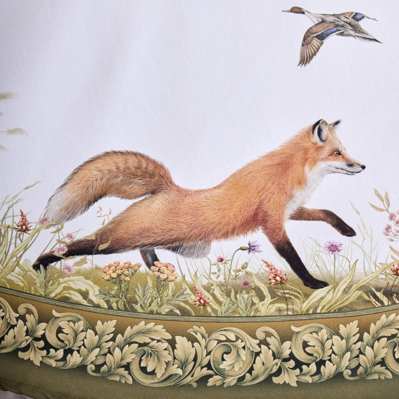 Оформлена принтом в охотничьей тематике: на белом фоне изображены лиса, утки, зайцы и фазаны среди трав и кустарников. Рисунок нанесён методом цифровой печати — чёткий, детализированный, стойкий к выцветанию.