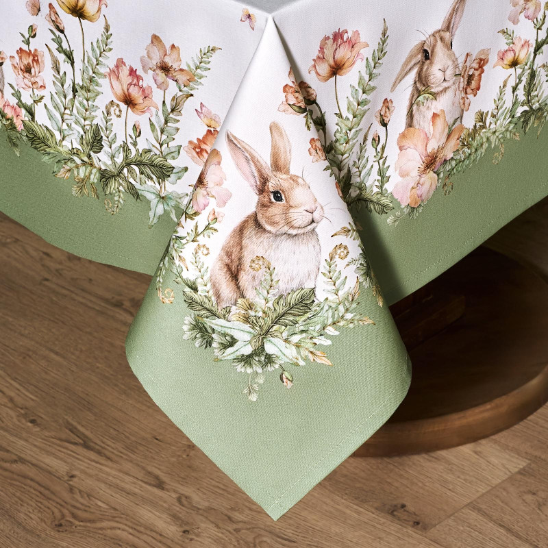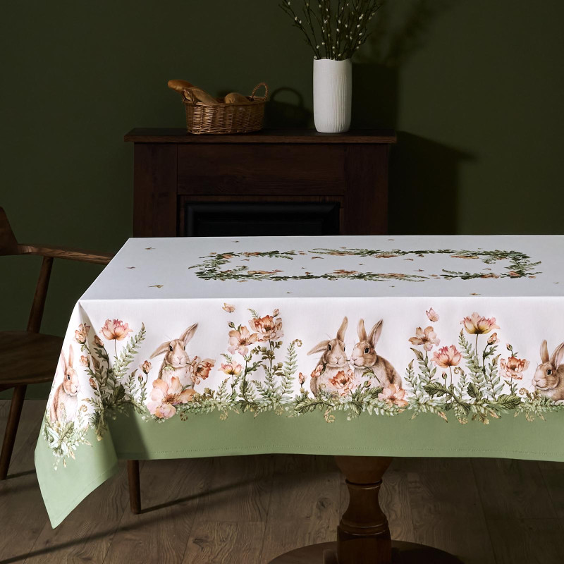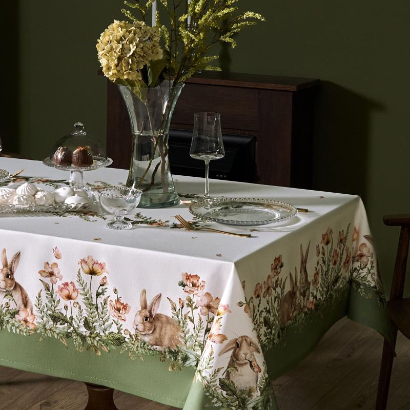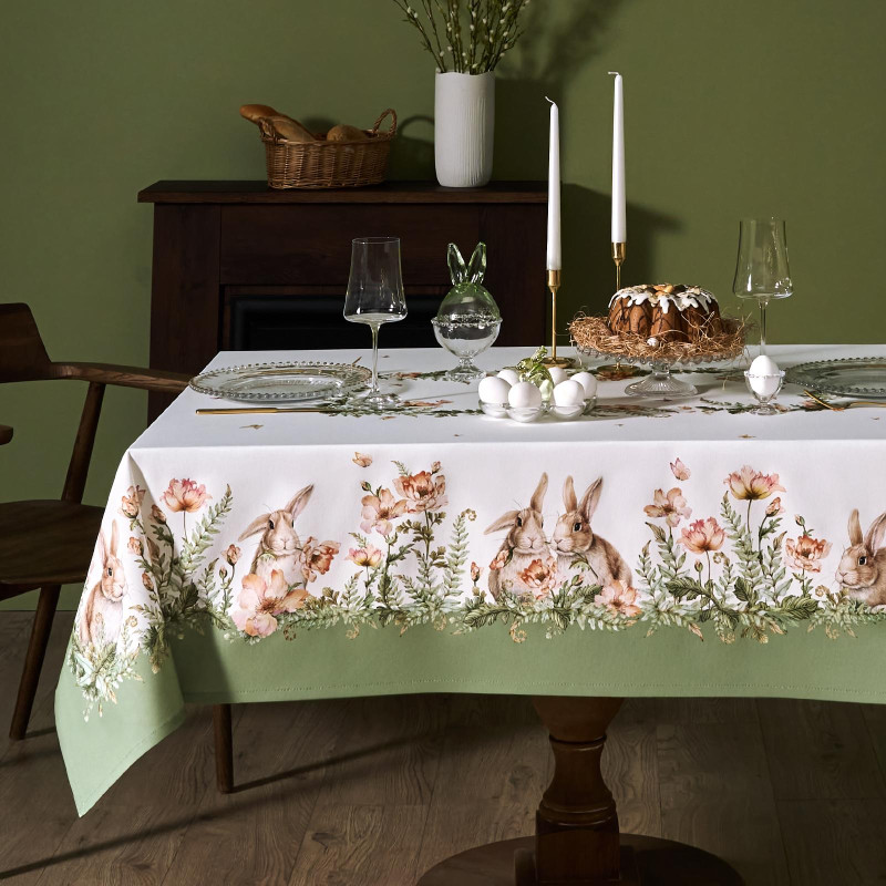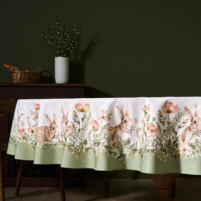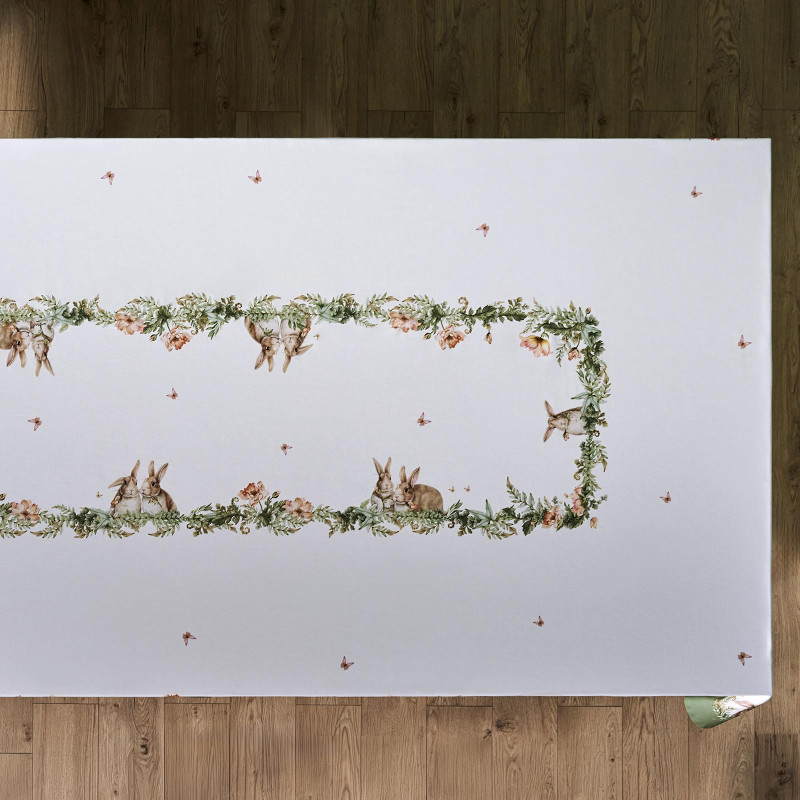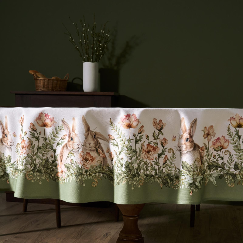 Принт с милыми кроликами, нежными зелёными оттенками и природными мотивами делает изделие выразительным элементом декора, благодаря которому стол становится центром внимания. Он создаёт атмосферу уюта и гармонии на кухне, даче или в гостиной
