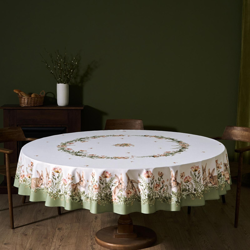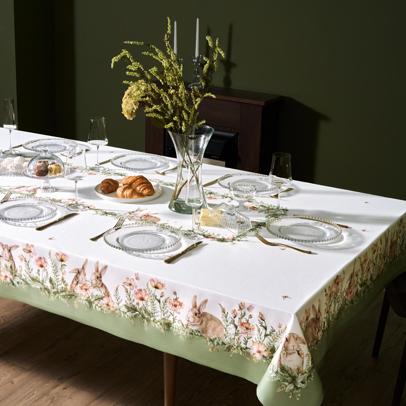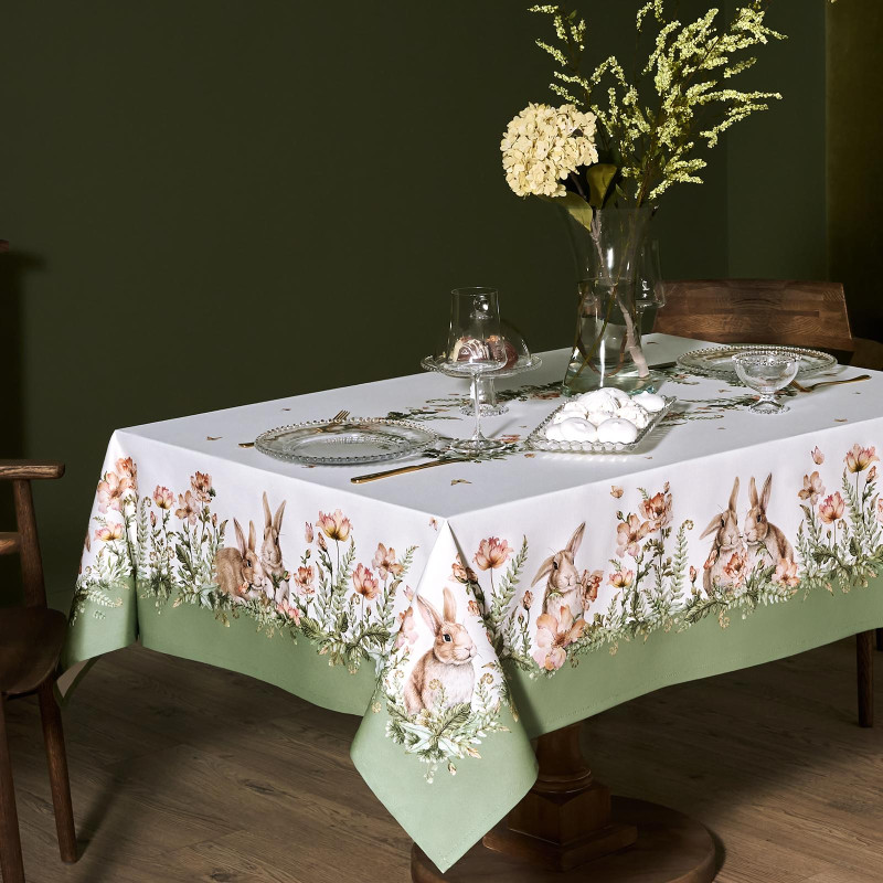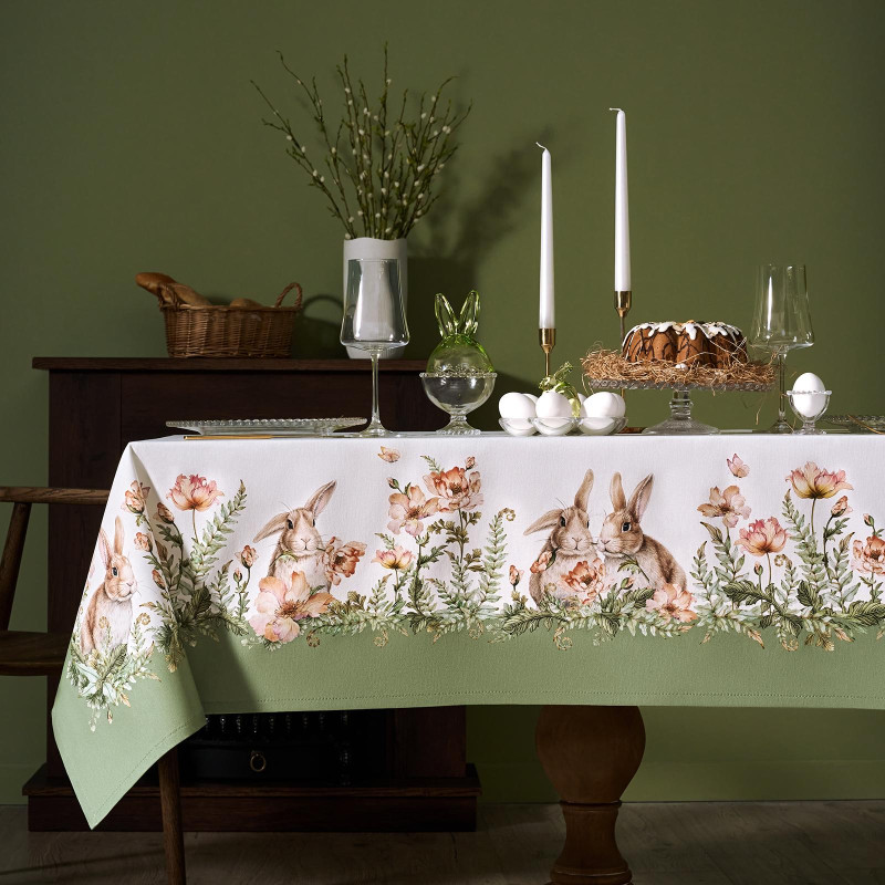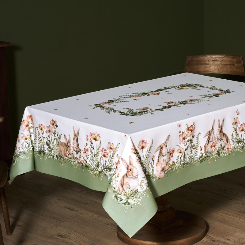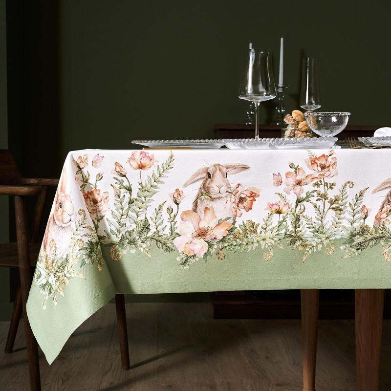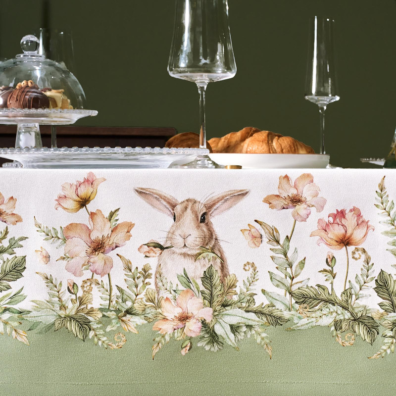 Принт с милыми кроликами, нежными зелёными оттенками и природными мотивами делает изделие выразительным элементом декора, благодаря которому стол становится центром внимания. Он создаёт атмосферу уюта и гармонии на кухне, даче или в гостиной