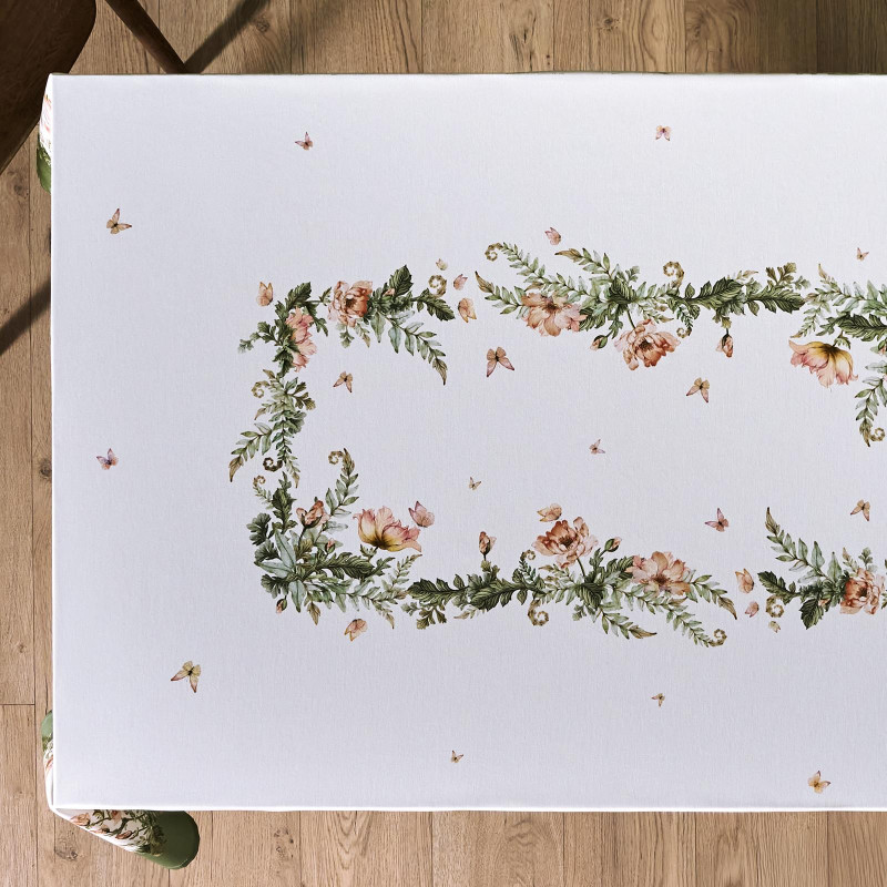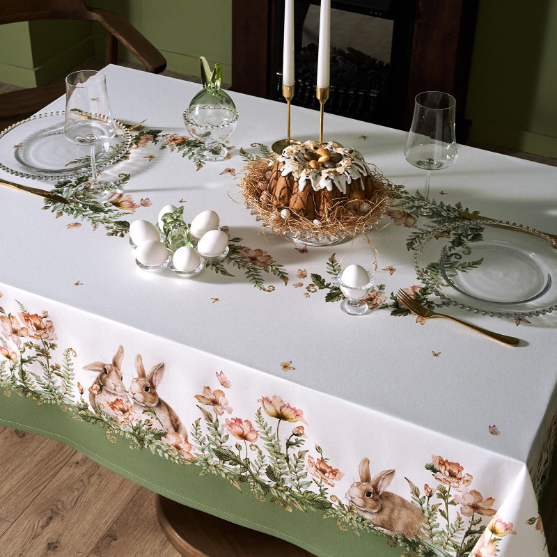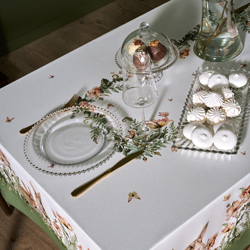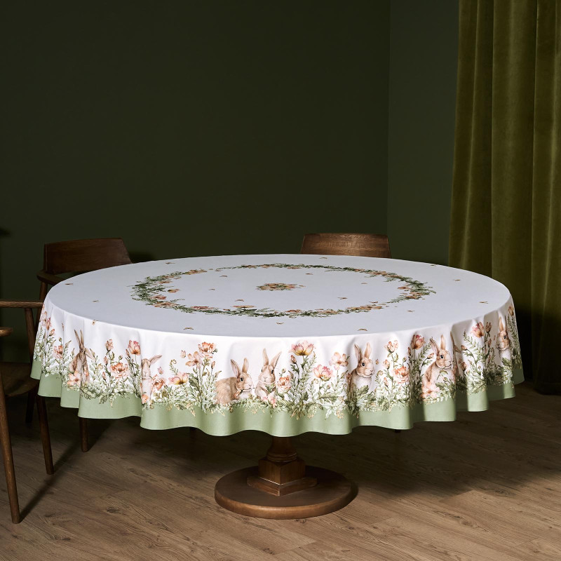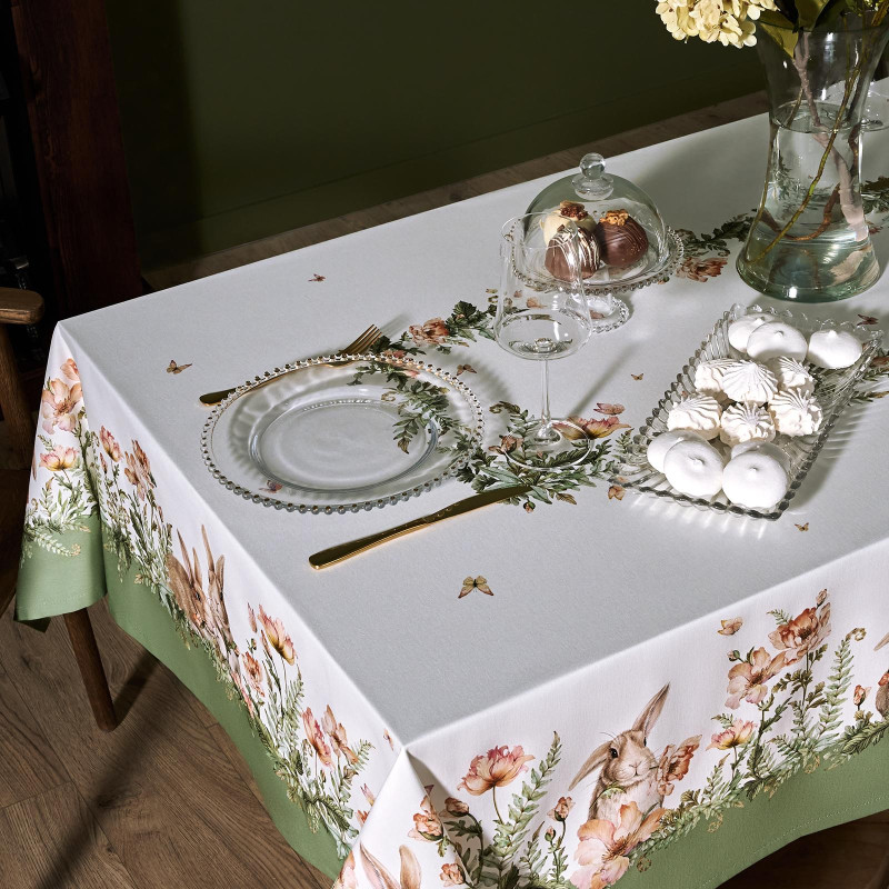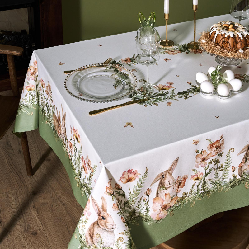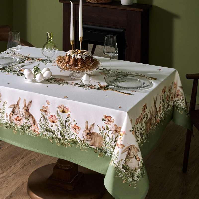 Принт с милыми кроликами, нежными зелёными оттенками и природными мотивами делает изделие выразительным элементом декора, благодаря которому стол становится центром внимания. Он создаёт атмосферу уюта и гармонии на кухне, даче или в гостиной