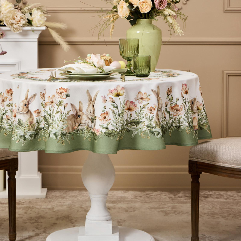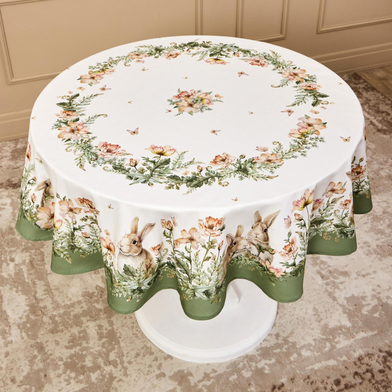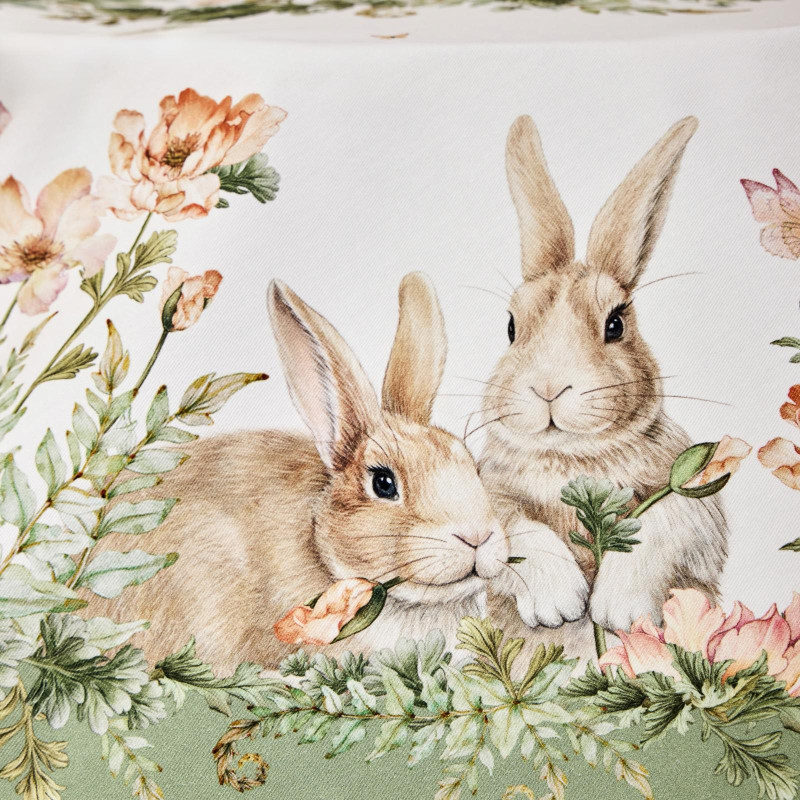 Принт с милыми зайчиками и натуральные тона делают скатерть акцентным элементом декора, добавляя уюта и мягкости в интерьер. Идеально подойдёт для повседневной сервировки, праздничного стола, пикника или ужина на террасе.