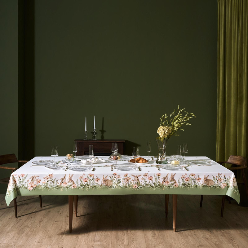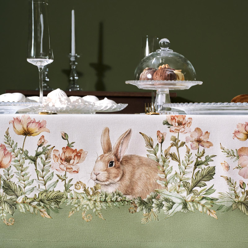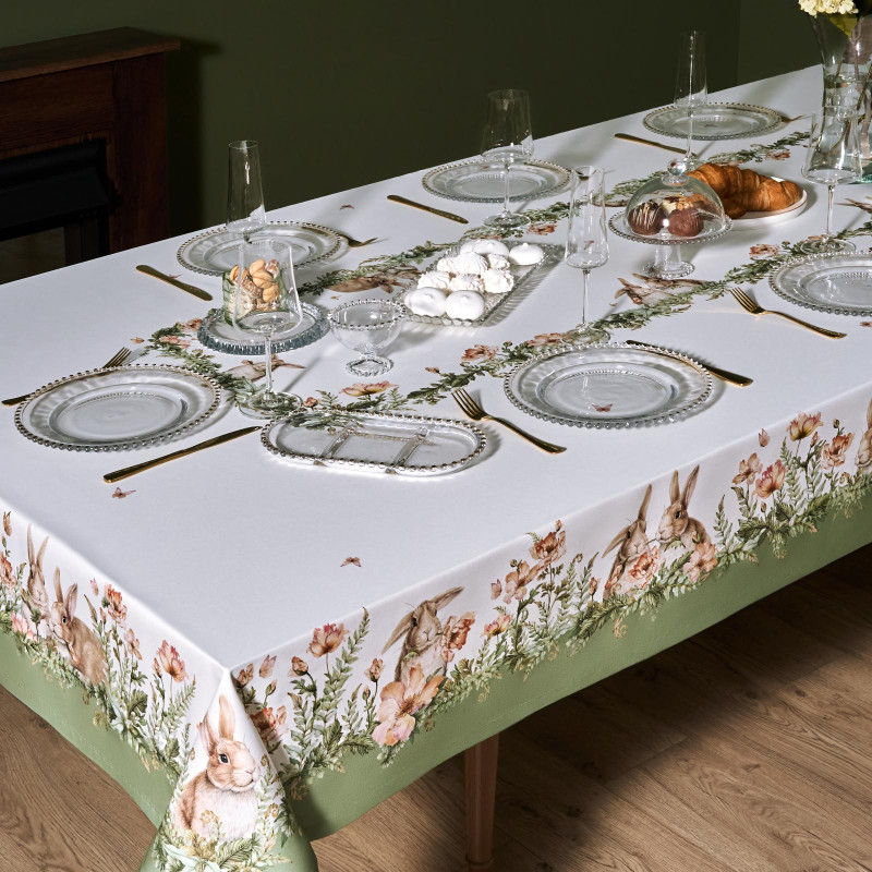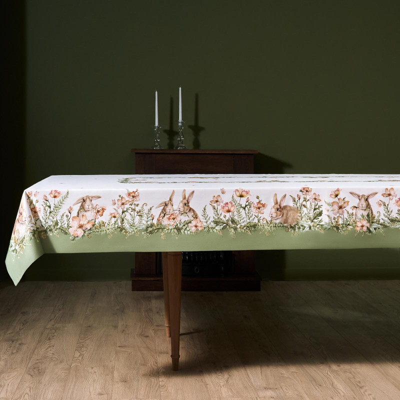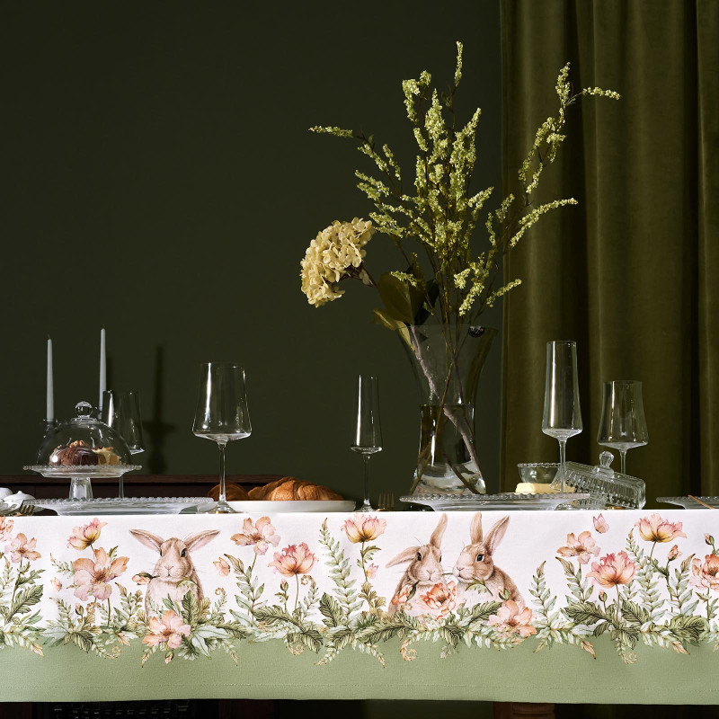 Принт с милыми кроликами, нежными зелёными оттенками и природными мотивами делает изделие выразительным элементом декора, благодаря которому стол становится центром внимания. Он создаёт атмосферу уюта и гармонии на кухне, даче или в гостиной