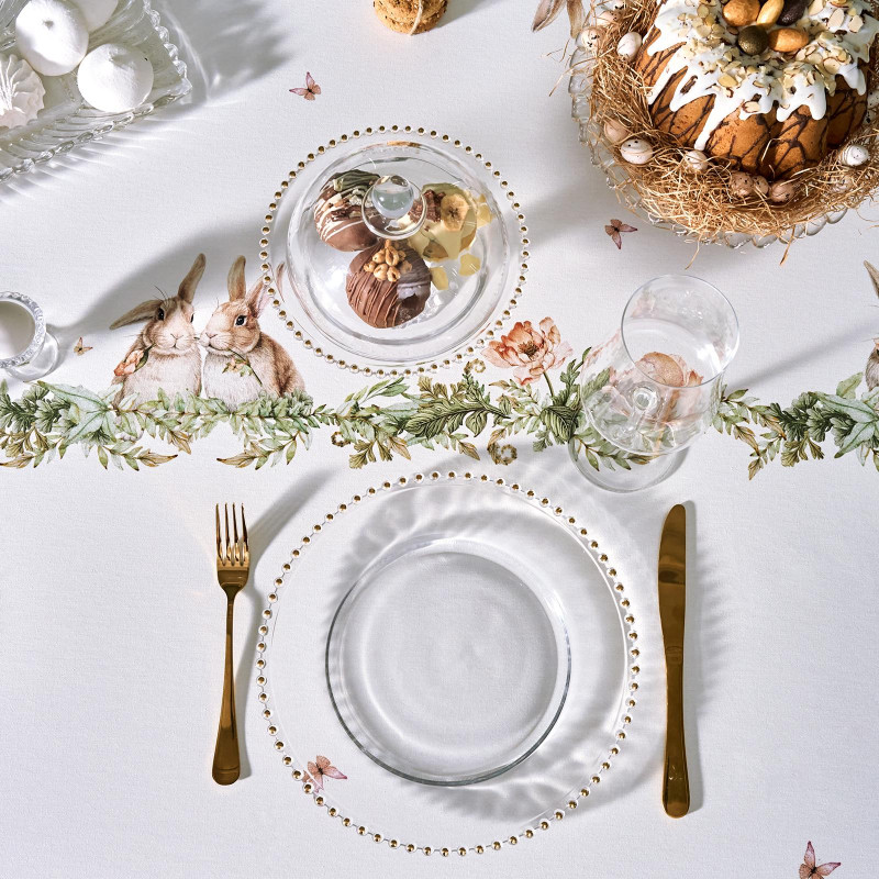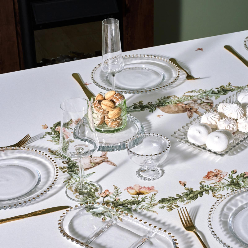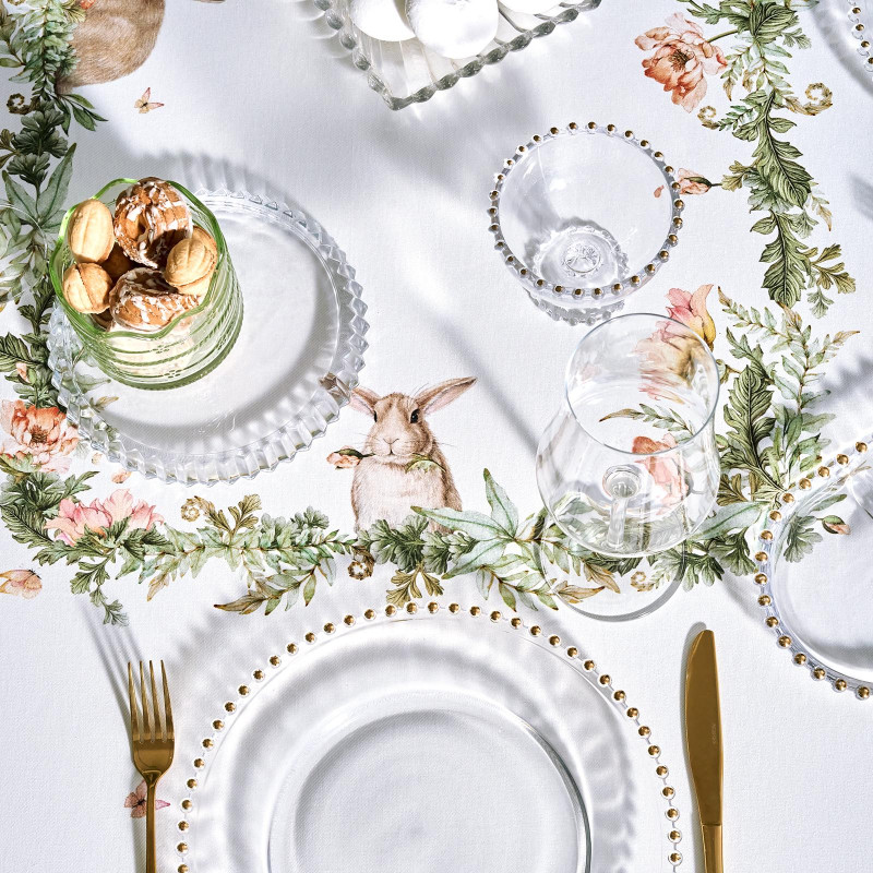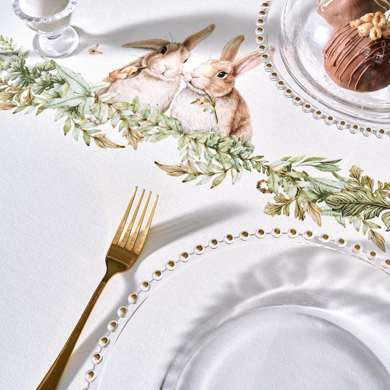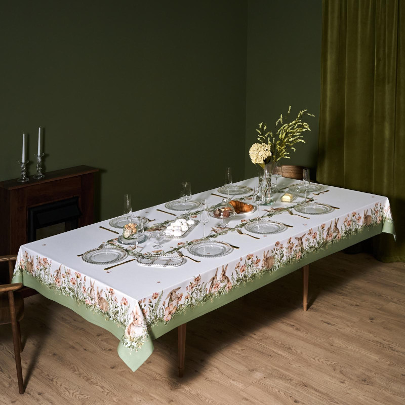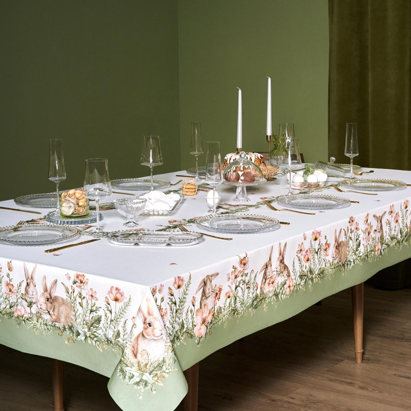 Принт с милыми кроликами, нежными зелёными оттенками и природными мотивами делает изделие выразительным элементом декора, благодаря которому стол становится центром внимания. Он создаёт атмосферу уюта и гармонии на кухне, даче или в гостиной