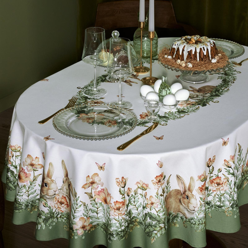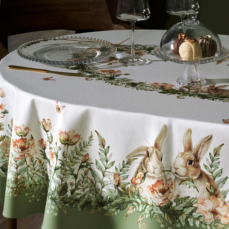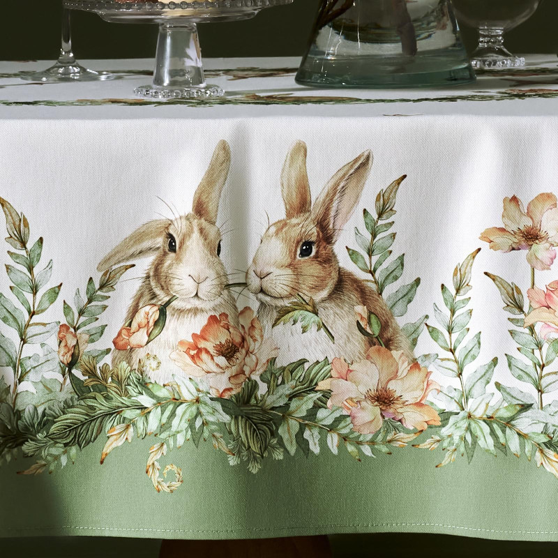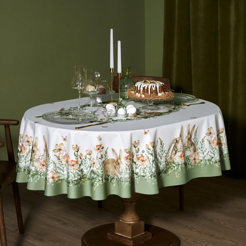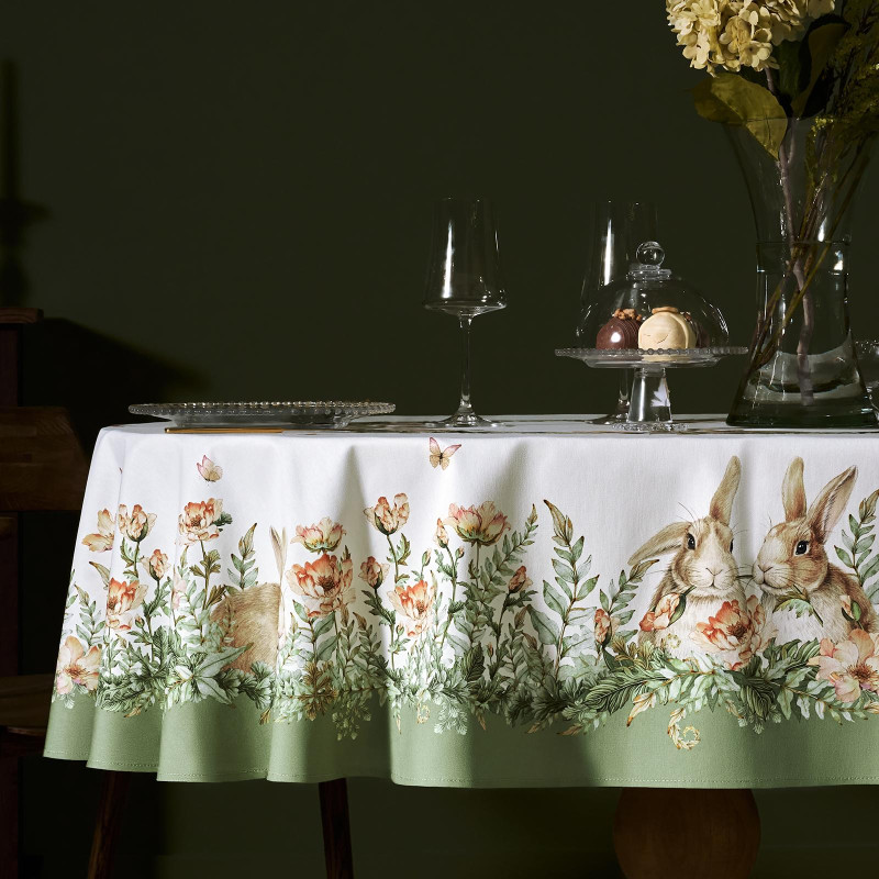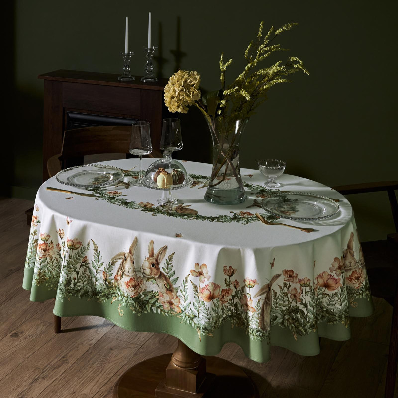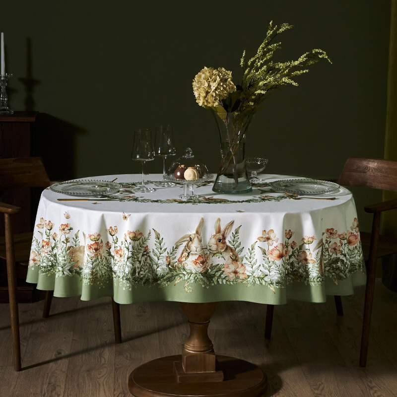Принт с милыми кроликами, нежными зелёными оттенками и природными мотивами делает изделие выразительным элементом декора, благодаря которому стол становится центром внимания. Он создаёт атмосферу уюта и гармонии на кухне, даче или в гостиной.