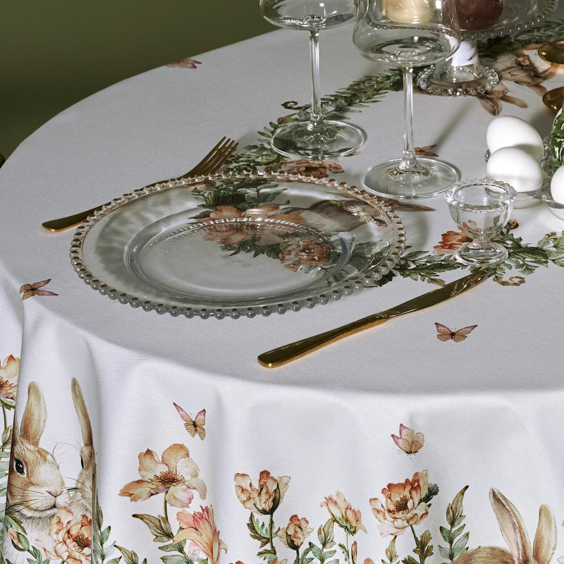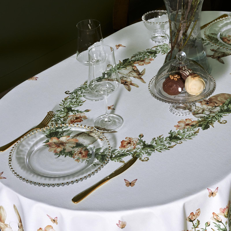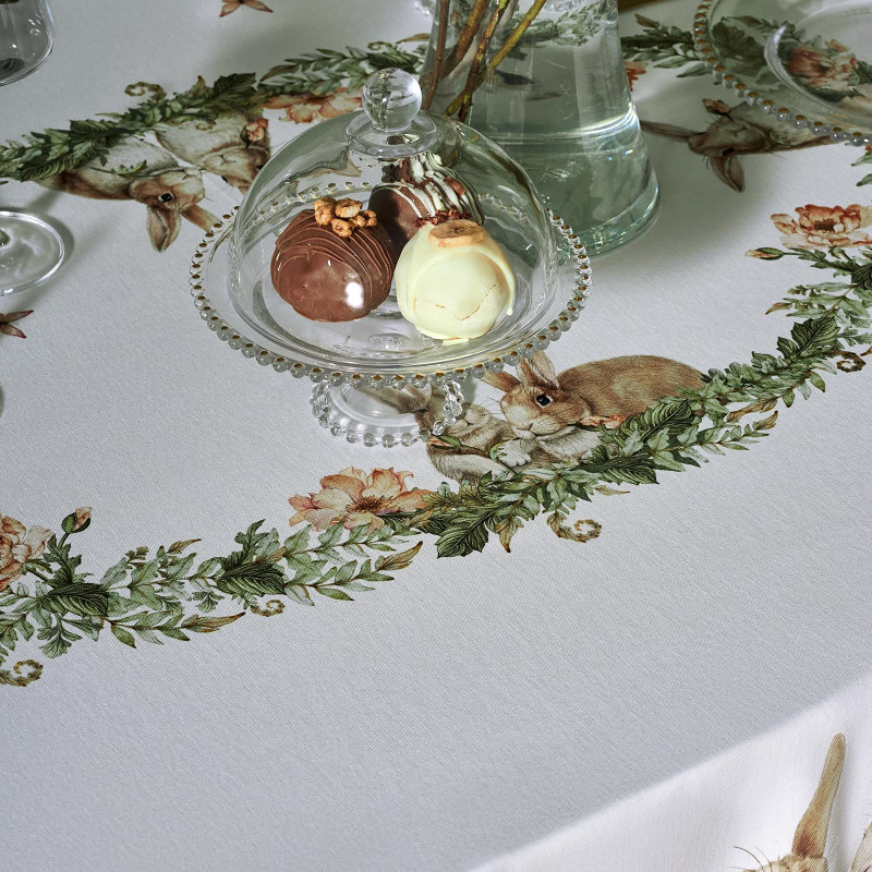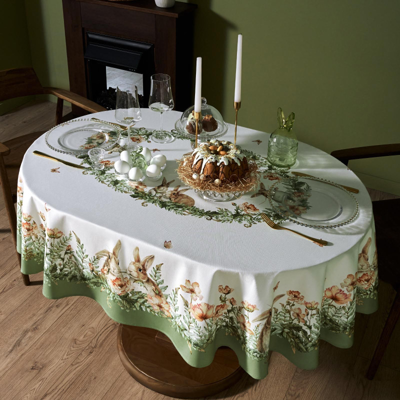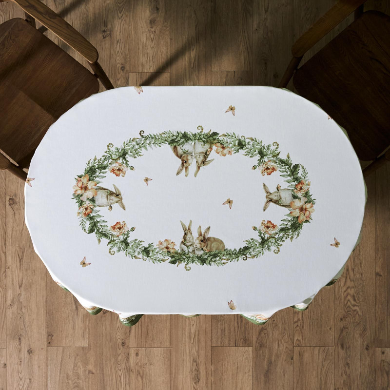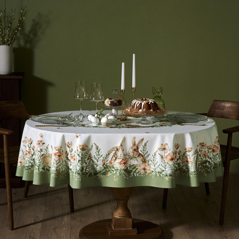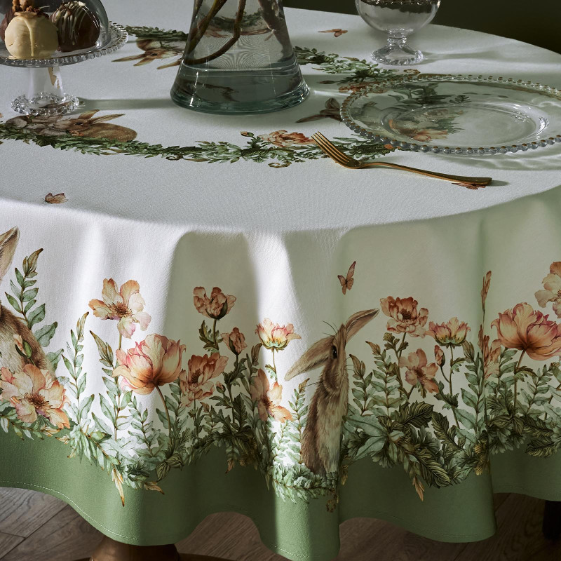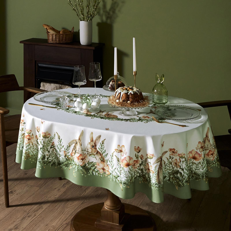 Принт с милыми кроликами, нежными зелёными оттенками и природными мотивами делает изделие выразительным элементом декора, благодаря которому стол становится центром внимания. Он создаёт атмосферу уюта и гармонии на кухне, даче или в гостиной.