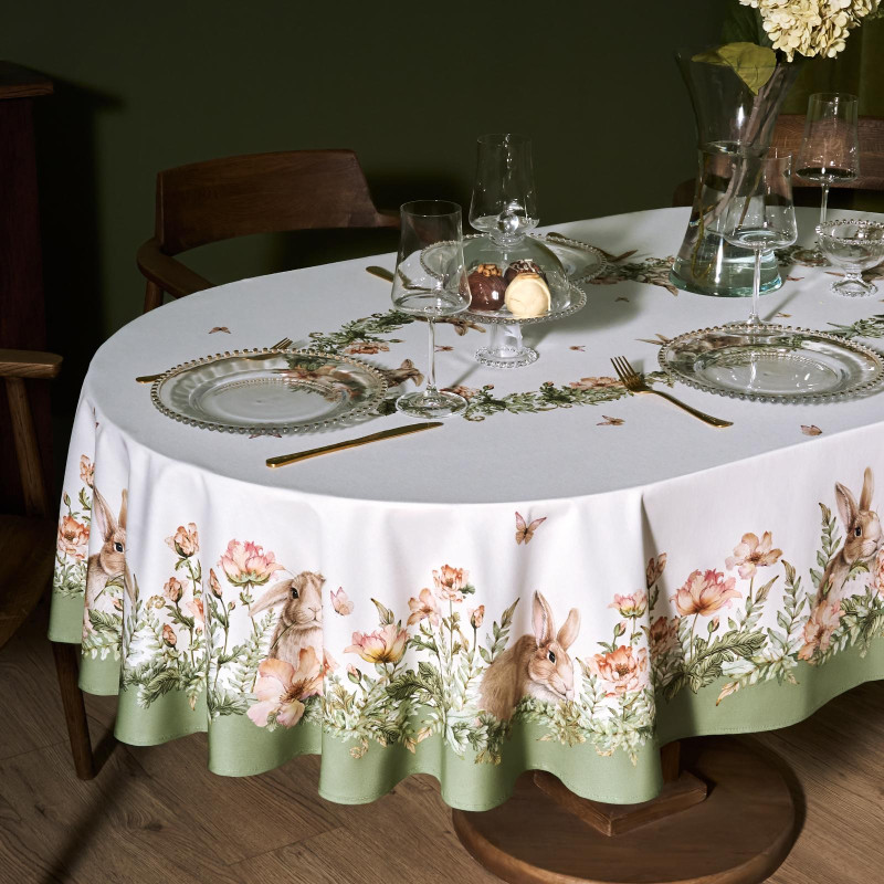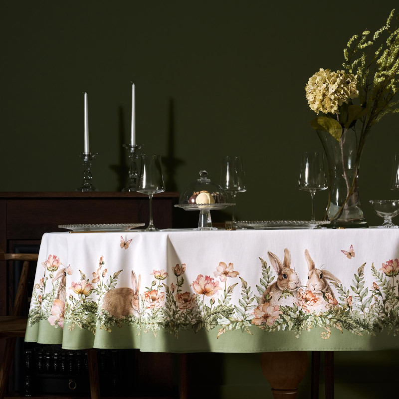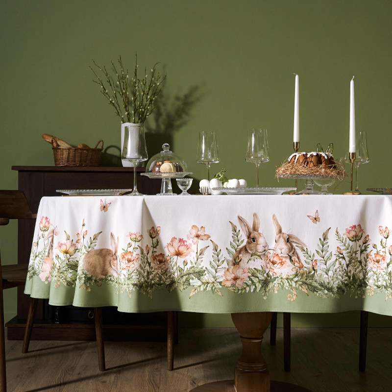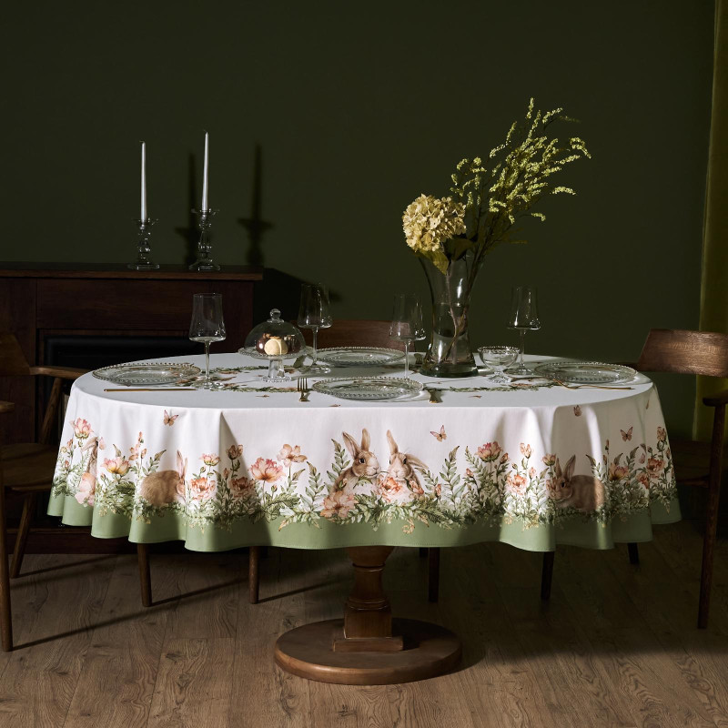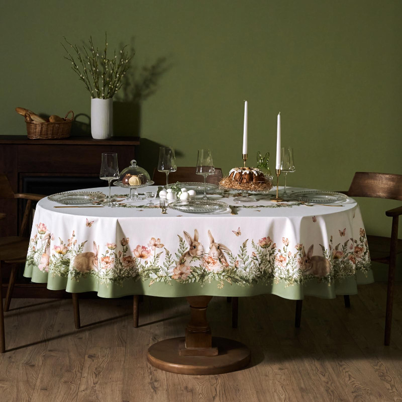 Принт с милыми кроликами, нежными зелёными оттенками и природными мотивами делает изделие выразительным элементом декора, благодаря которому стол становится центром внимания. Он создаёт атмосферу уюта и гармонии на кухне, даче или в гостиной