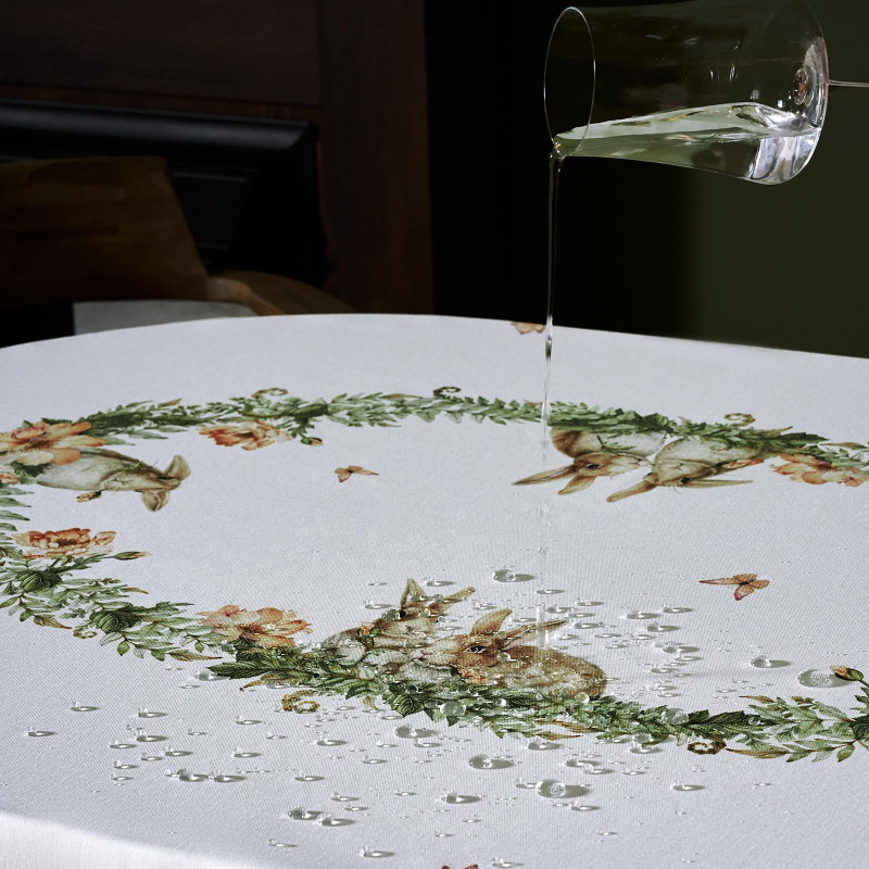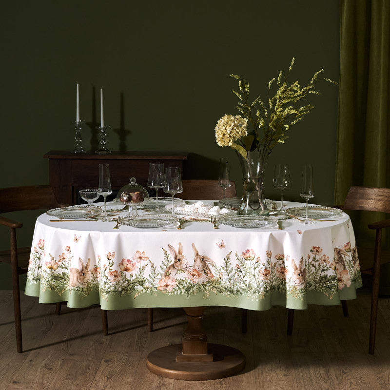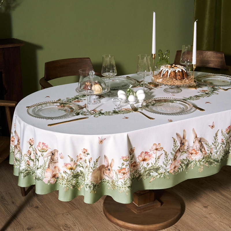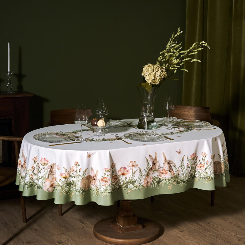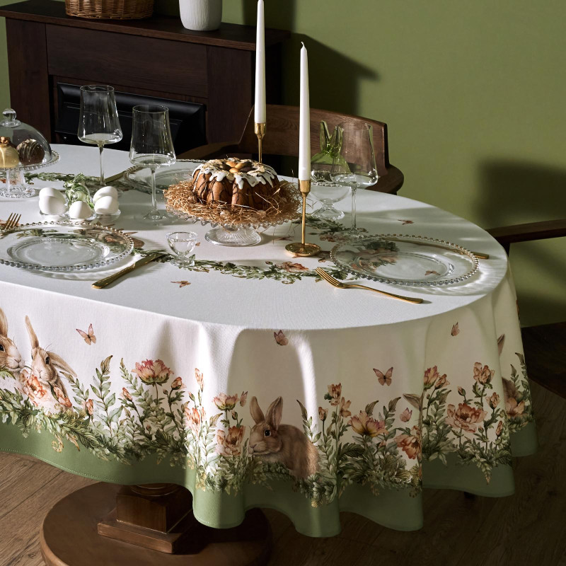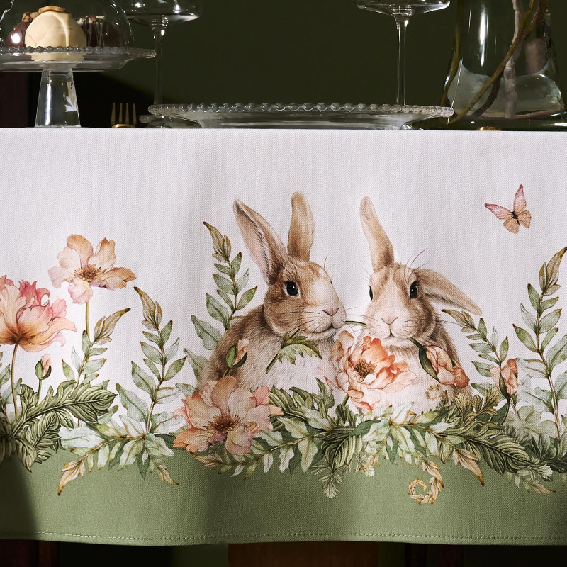 Принт с милыми кроликами, нежными зелёными оттенками и природными мотивами делает изделие выразительным элементом декора, благодаря которому стол становится центром внимания. Он создаёт атмосферу уюта и гармонии на кухне, даче или в гостиной