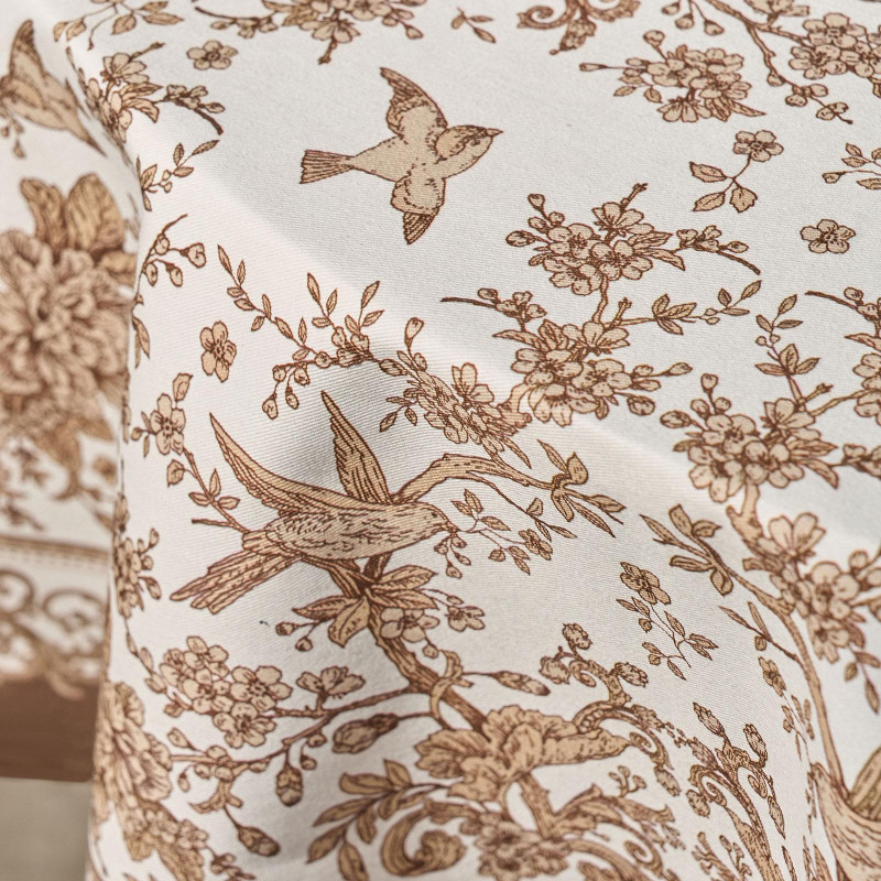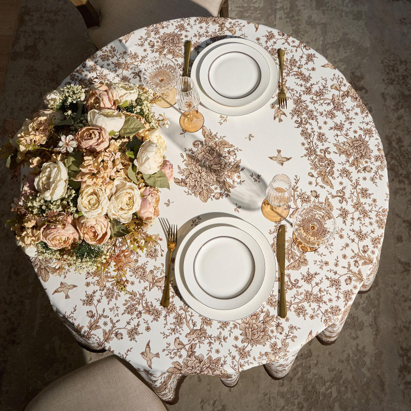 Диаметр — 190 см, подходит для круглых и овальных столов 100, 110, 120, 130 см, обеспечивая эстетичный свес. Плотное хлопковое полотно устойчиво к износу, а цифровая печать сохраняет насыщенность цвета даже после многократных стирок.
