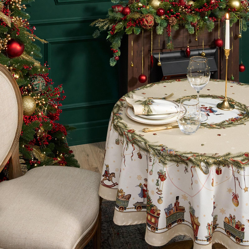 Круглая новогодняя скатерть Lefard «Щелкунчик» диаметр 150 см — элегантное украшение стола и элемент рождественского декора дома. Подходит для круглых столов диаметром 70–100 см, создавая аккуратный равномерный свес.