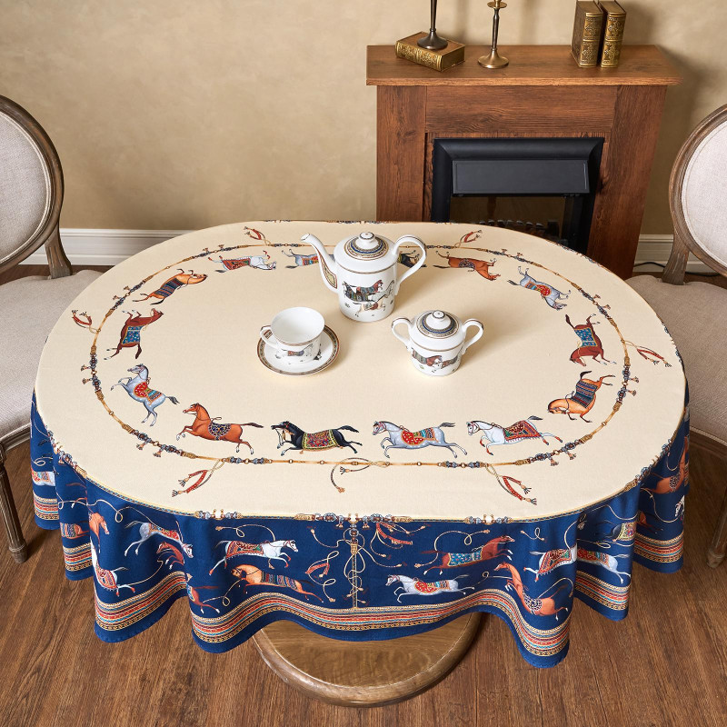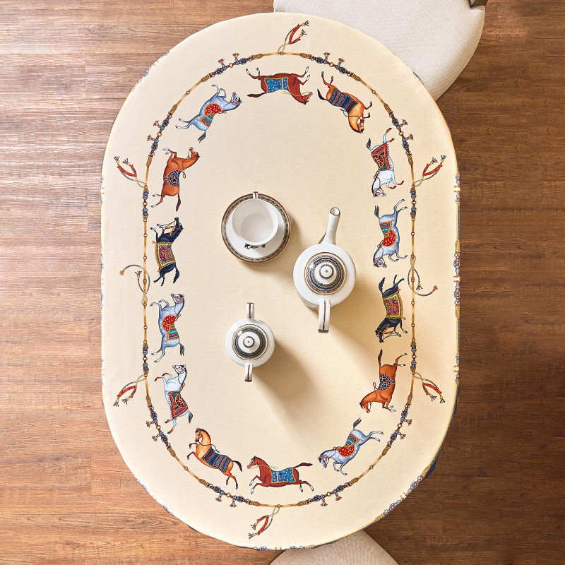 Благородный тёмно-синий фон украшен орнаментом с грациозными лошадьми, создавая атмосферу восточной роскоши. Лошадь — символ 2026 года, поэтому скатерть будет актуальна как для ежедневного использования в интерьере в стиле бохо, так и для праздничной сервировки. Авторский принт разработан художниками эксклюзивно для Lefard и нанесён методом цифровой печати, что гарантирует яркость и стойкость красок даже после множества стирок.