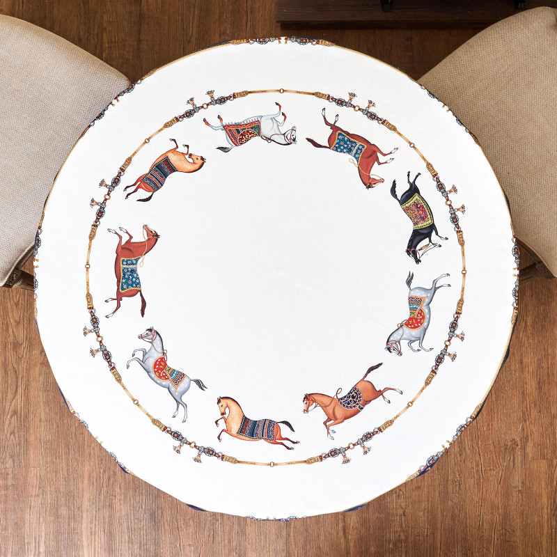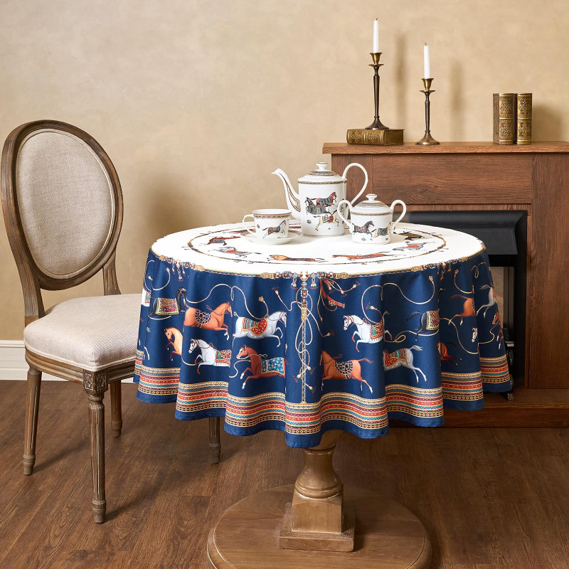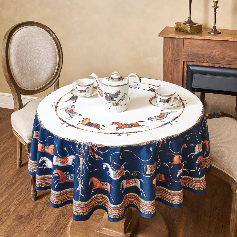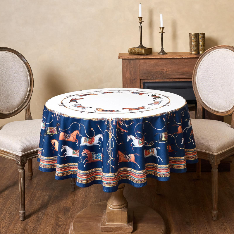 Темно-синий фон украшен авторским орнаментом с изящными лошадьми — символом 2026 года. Такой принт делает скатерть особенно уместной для праздничной сервировки и стильным украшением интерьера. Рисунок разработан художниками Lefard и нанесён методом цифровой печати, что обеспечивает стойкость красок даже после множества стирок.