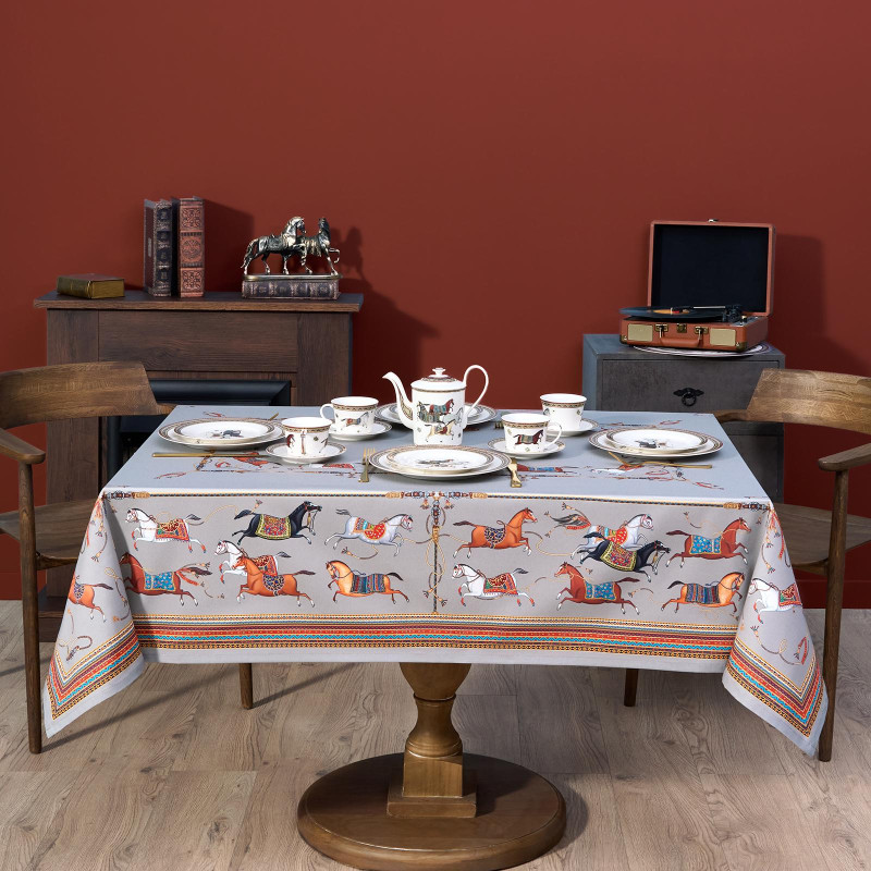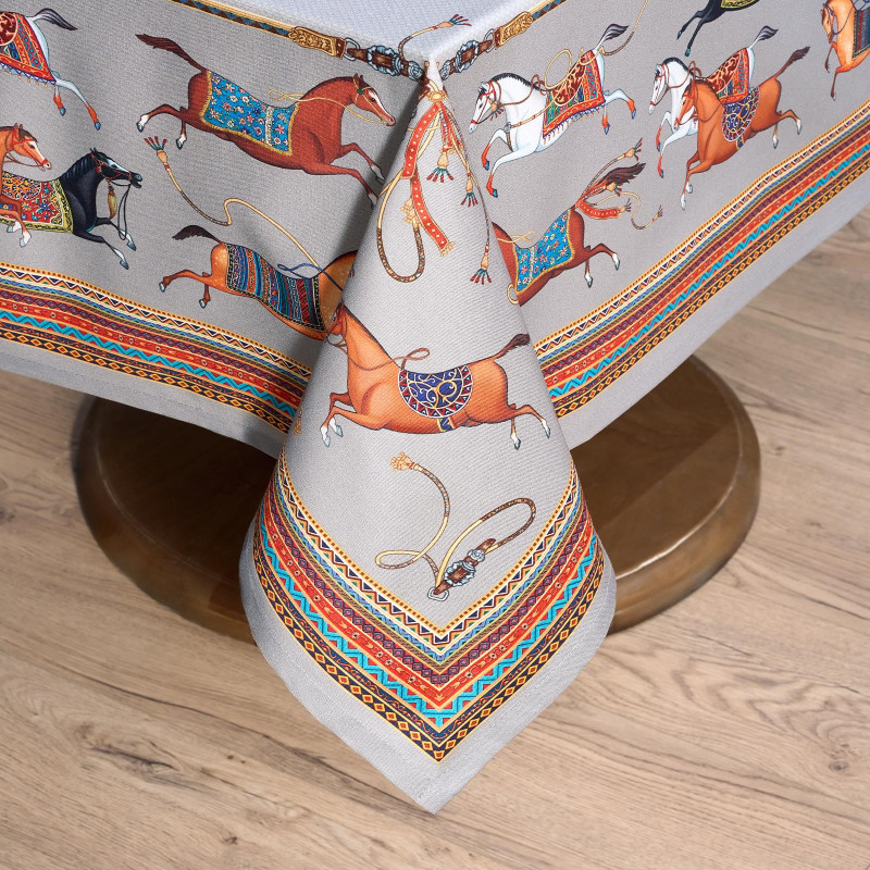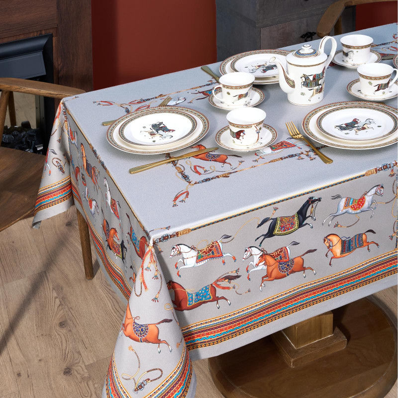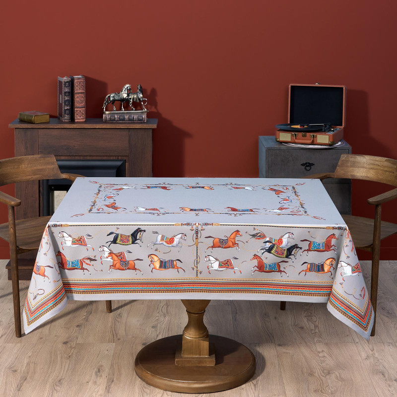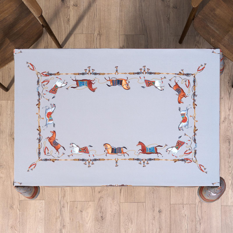 Серый фон дополнен авторским орнаментом с изящными лошадьми — символом 2026 года. Такой акцент делает скатерть актуальной для праздничной сервировки и стильным украшением интерьера. Рисунок создан художниками Lefard и нанесён методом цифровой печати — краски сохраняют яркость даже после многократных стирок.
