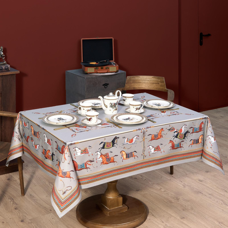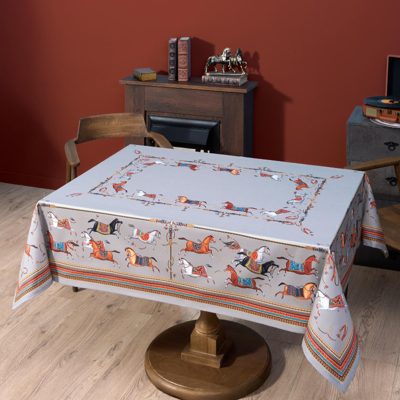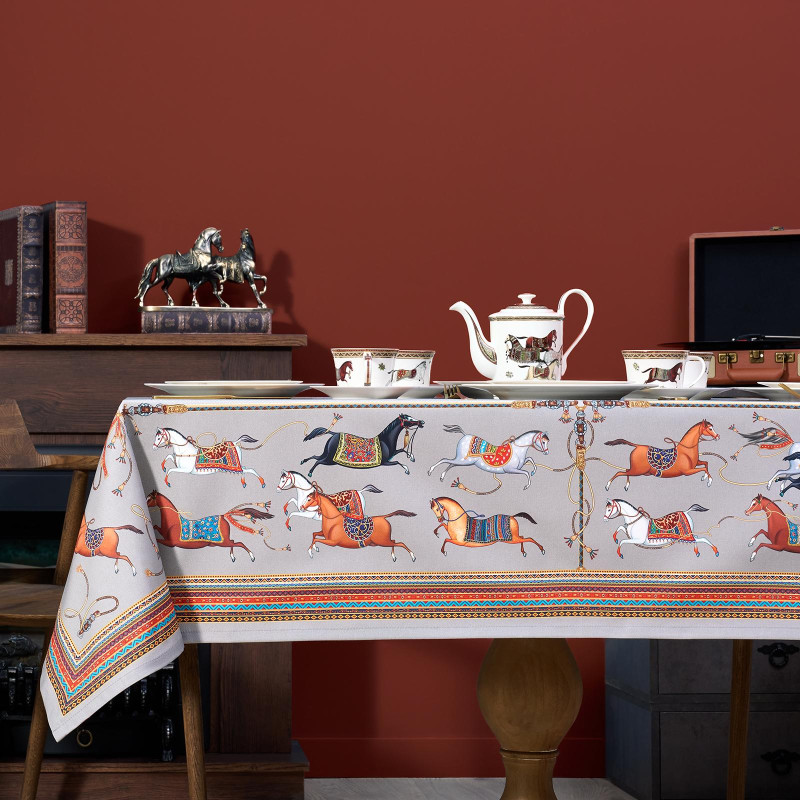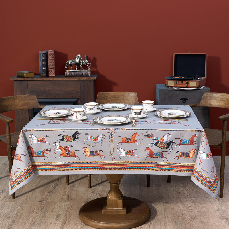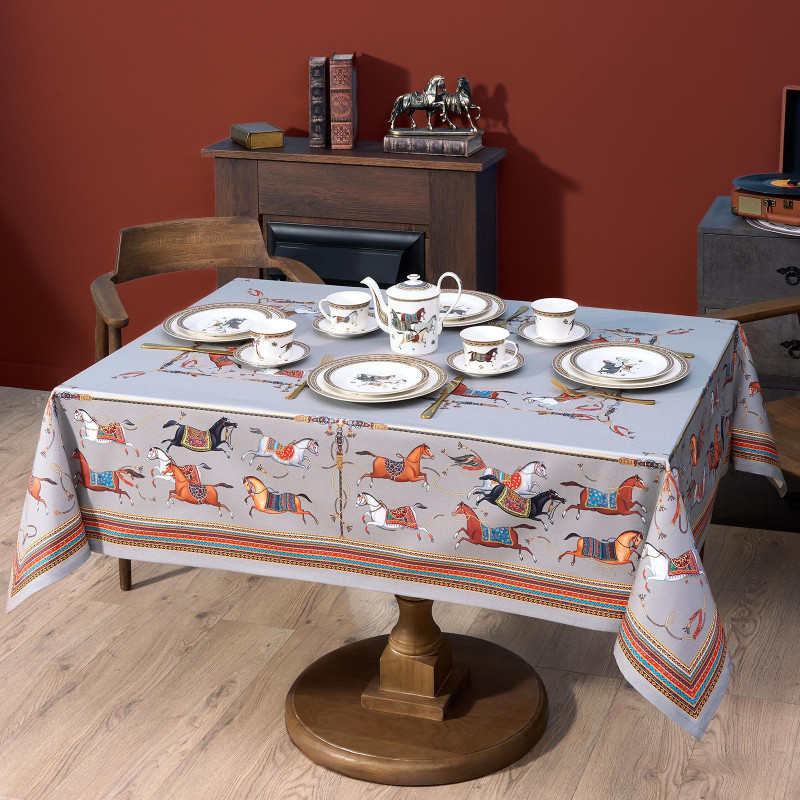 Серый фон дополнен авторским орнаментом с изящными лошадьми — символом 2026 года. Такой акцент делает скатерть актуальной для праздничной сервировки и стильным украшением интерьера. Рисунок создан художниками Lefard и нанесён методом цифровой печати — краски сохраняют яркость даже после многократных стирок.