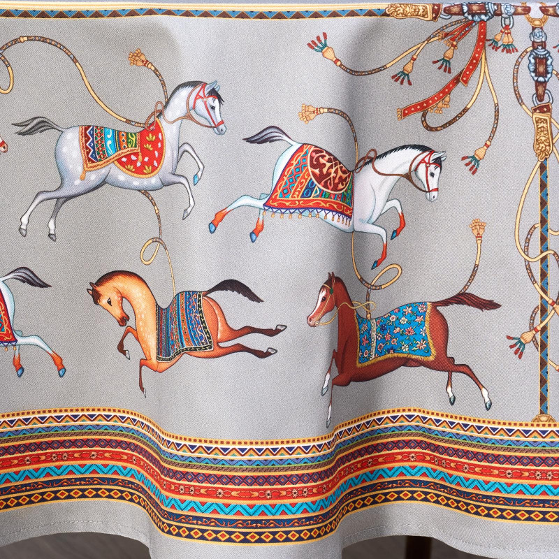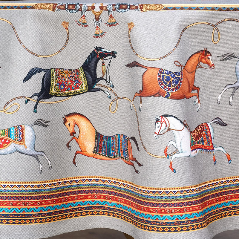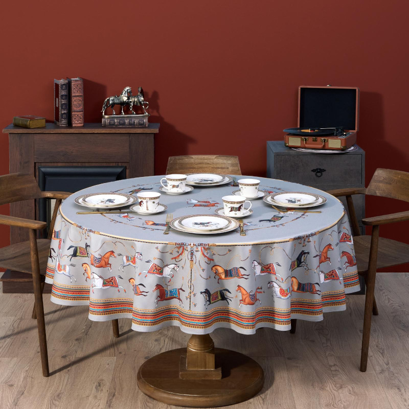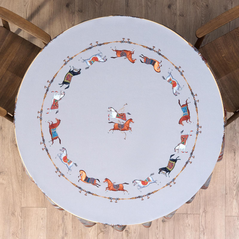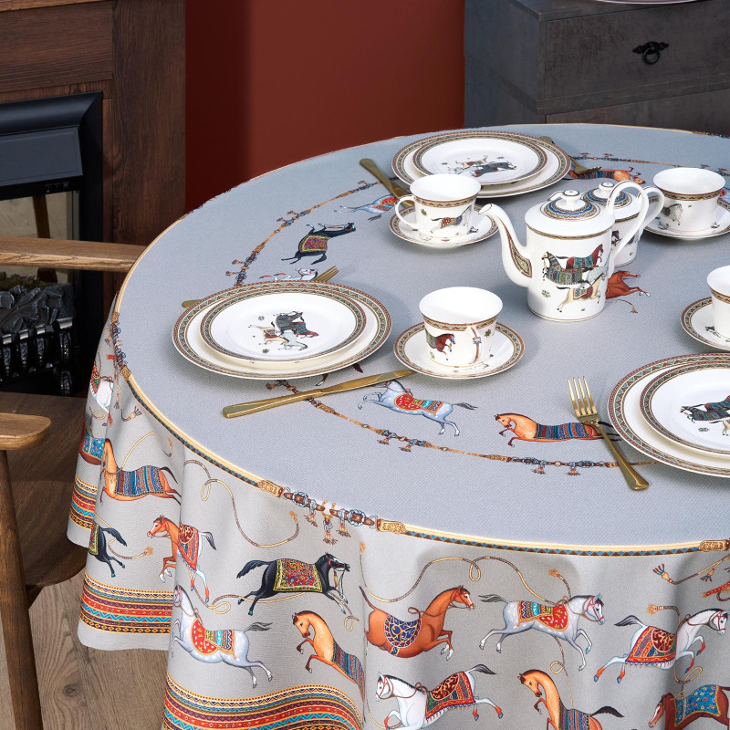 Темно-синий фон украшен авторским орнаментом с изящными лошадьми — символом 2026 года. Такой принт делает скатерть особенно уместной для праздничной сервировки и стильным украшением интерьера. Рисунок разработан художниками Lefard и нанесён методом цифровой печати, что обеспечивает стойкость красок даже после множества стирок.