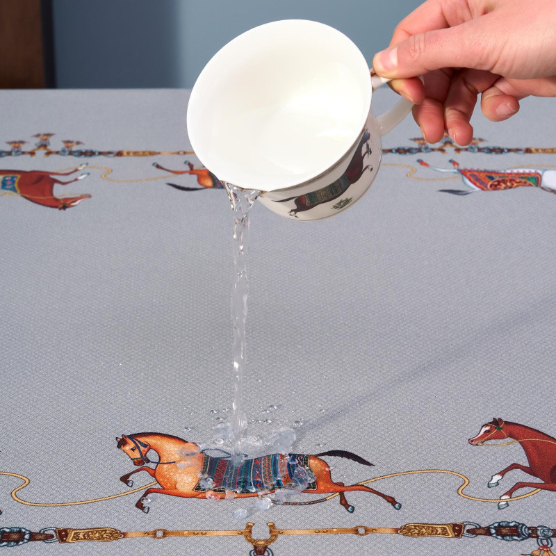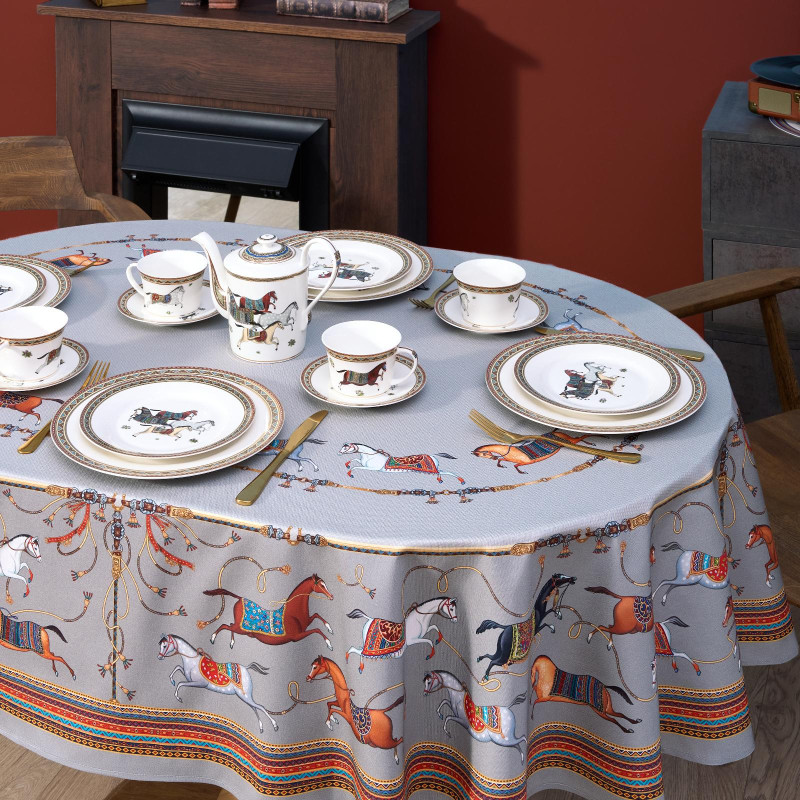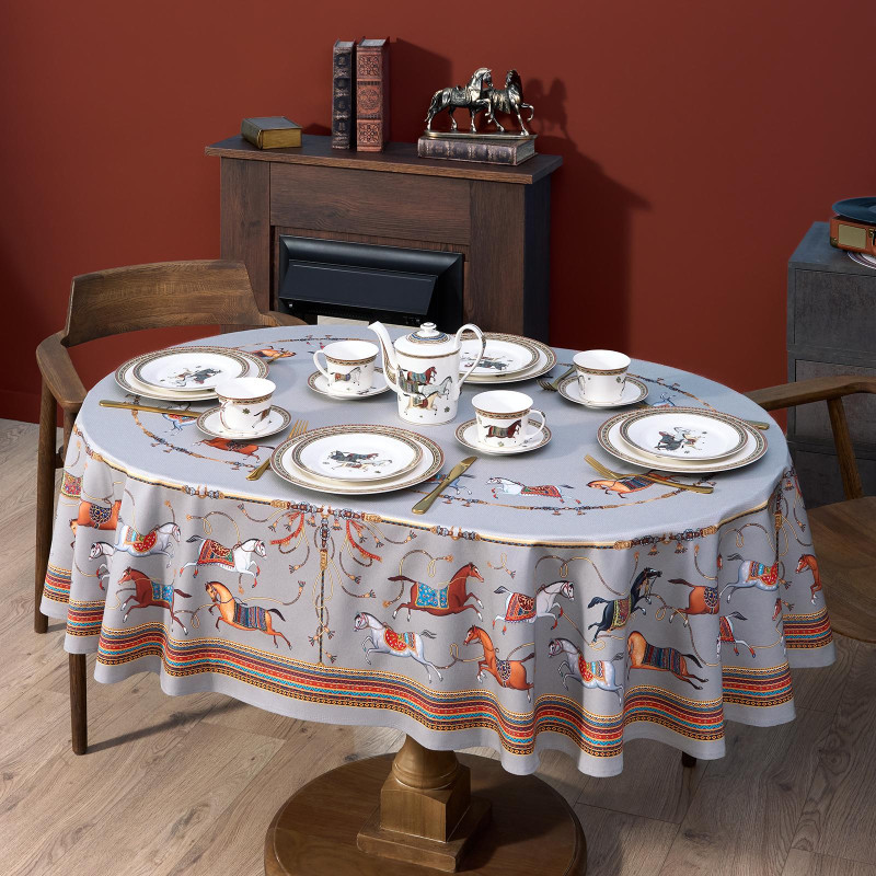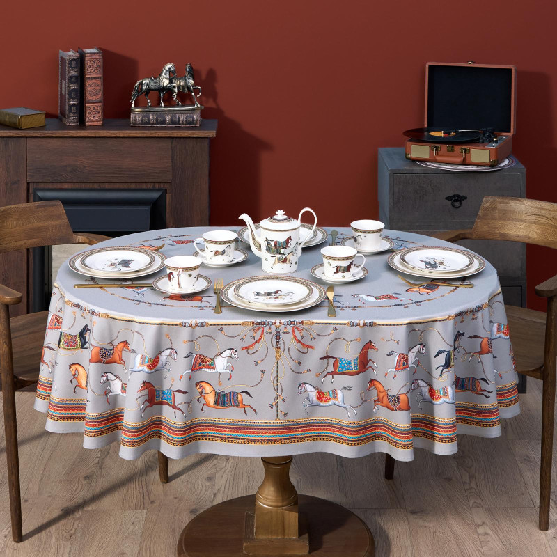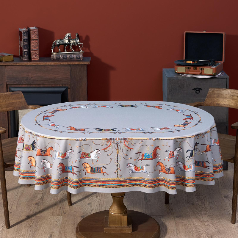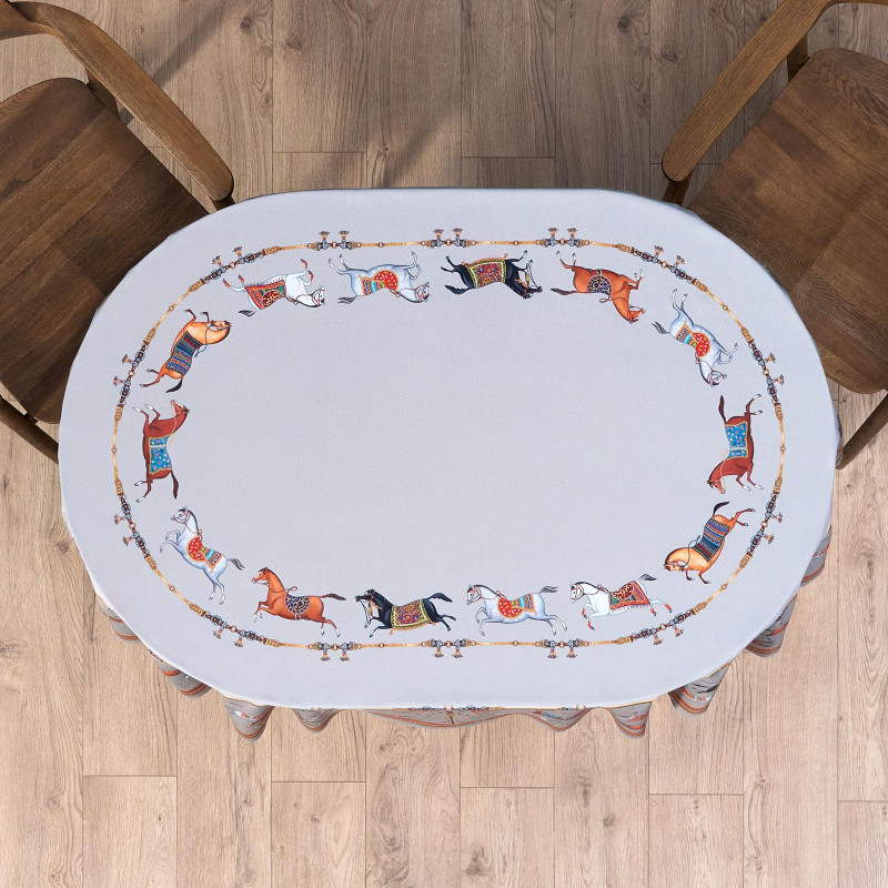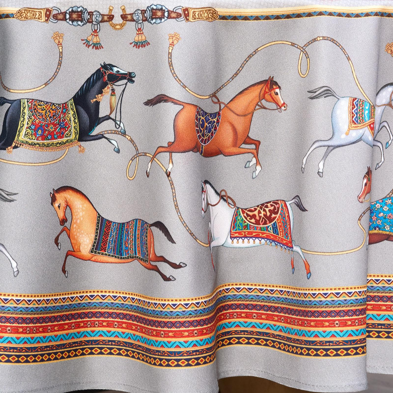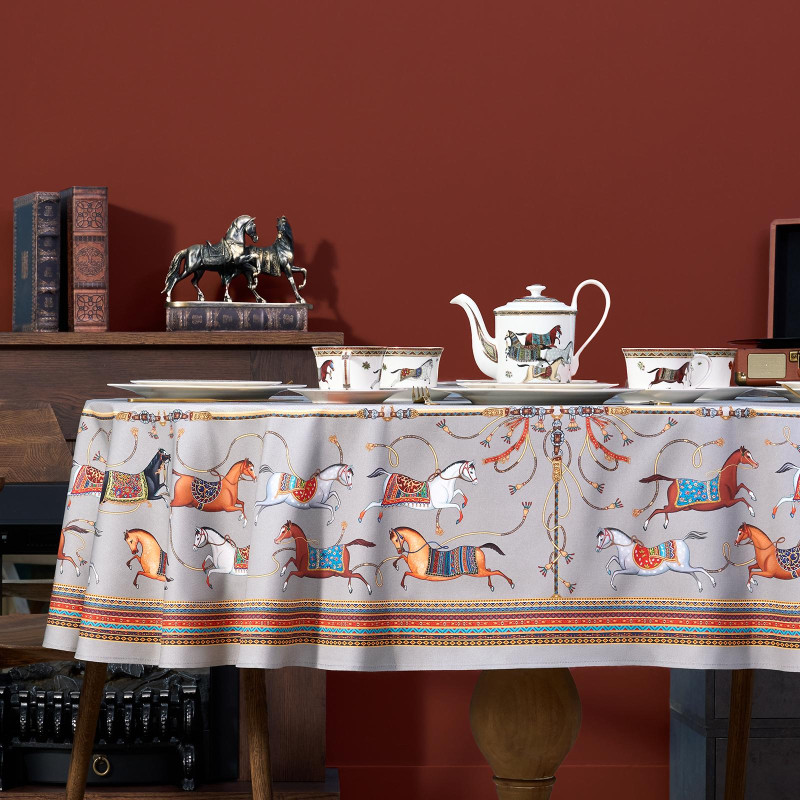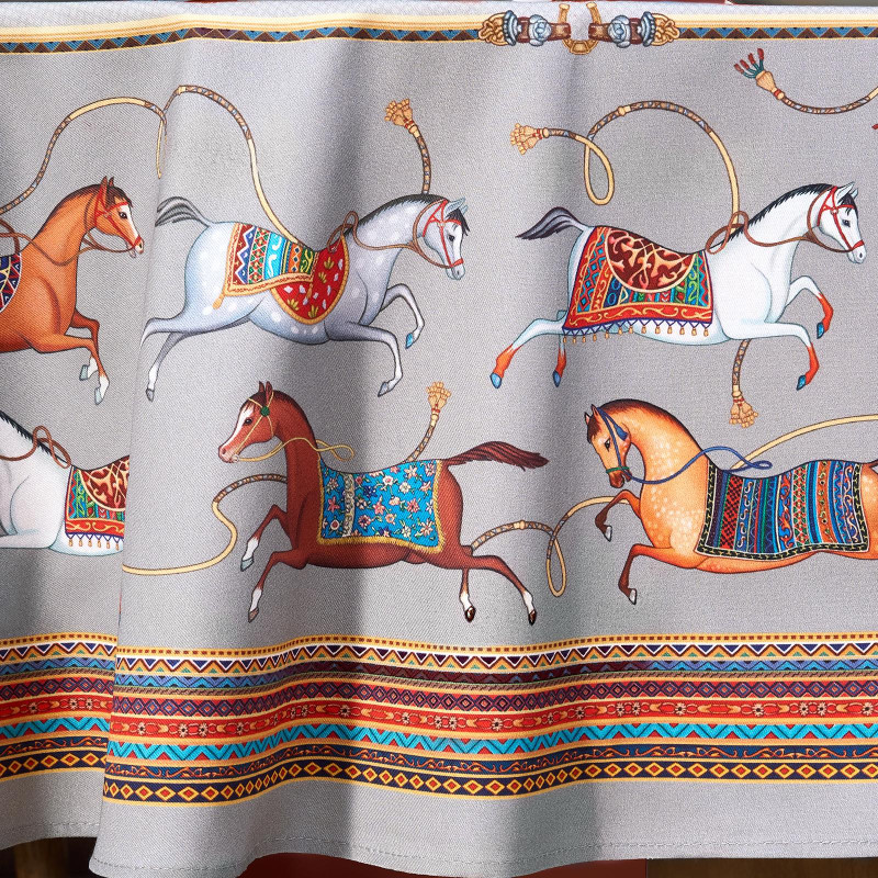 Благородный фон украшен орнаментом с грациозными лошадьми, создавая атмосферу восточной роскоши. Лошадь — символ 2026 года, поэтому скатерть будет актуальна как для ежедневного использования в интерьере в стиле бохо, так и для праздничной сервировки. Авторский принт разработан художниками эксклюзивно для Lefard и нанесён методом цифровой печати, что гарантирует яркость и стойкость красок даже после множества стирок.